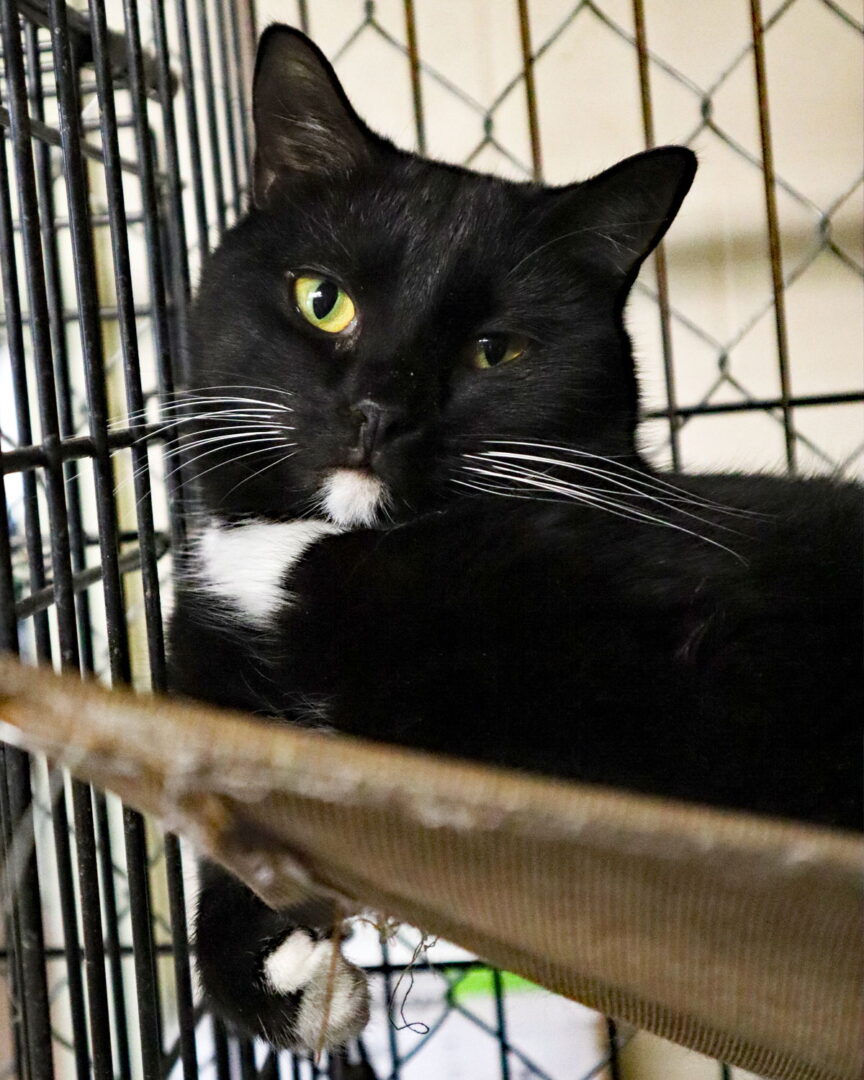 ChinChin and his sister Eve were born into an outdoor colony and came to us as very timid half- grown kittens. They are two of the many timid black cats that call the shelter home. ChinChin can be picked out of the lineup by his white chin. If you would like to give one or more of these black cats a home, please reach out to us. Chin Chin has leukemia but is very healthy. For more information on Chin Chin, please visit our website kvckr.com and complete/submit an adoption application.