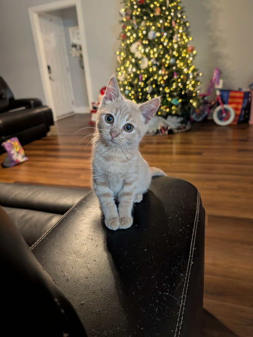 Chippy is an approximately 14-week-old kitten with a heart as big as his curious eyes. This sweet boy got his start in life after being found in a trash can, but you’d never know it by his loving and playful personality. He’s now thriving and ready to find a forever home of his own. Chippy is the perfect mix of playful and cuddly. He loves to explore, chase toys, and then curl up for a cozy nap right by your side. While he can still be a little skittish at times, he warms up quickly and blossoms with gentle patience and love. He’s up to date on his vaccines, microchipped and will be neutered on 1/23/26. Chippy is doing great socially — he is comfortable around both large and small dogs, gets along well with other cats, and adores kids. He would do wonderfully in a home that can give him affection, reassurance, and plenty of playtime. If you’re looking for a resilient little companion who will grow into a loyal, affectionate friend, Chippy is ready to steal your heart! Apply today at www.apsofpc.org