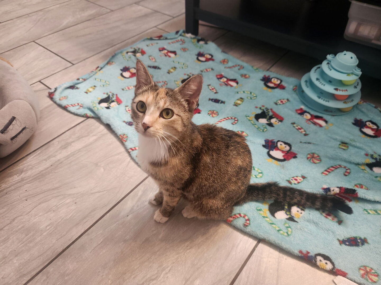Chloe is a female Calico about 1 yr old. She is very quiet. Likes to lay around and look pretty. Will be available mid-July after she is spayed and up to date on shots.