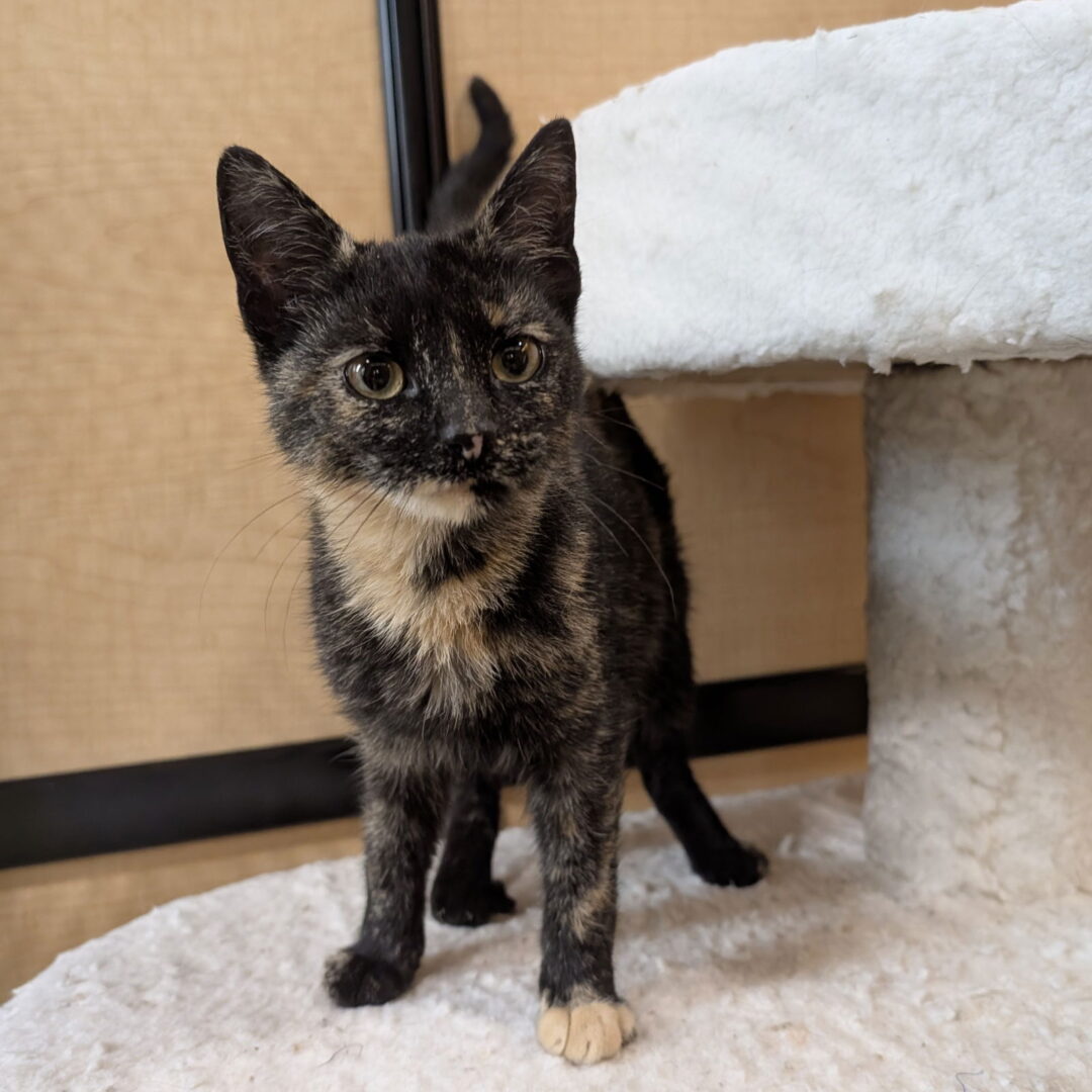 Hi there! My name is Christine, and I'm a 4-month-old female tortie DSH. I might be a little cautious when we first meet—I just need a bit of time to make sure you mean no harm. But once I get to know you, my sweet side comes out, and you'll see just how loving I can be! One of my favorite things about myself is my beautiful orange markings, especially the ones on my front paw. I think they make me pretty special! I also have a big brother named Larry, but don't worry, we don't have to be adopted together. I'm ready to find my forever home, and I can't wait to meet you! I am available for adoption at PetSmart Rockwall located at 931 E Interstate 30 Rockwall, TX 75087. For more information about me, please email cats@frastx.org.