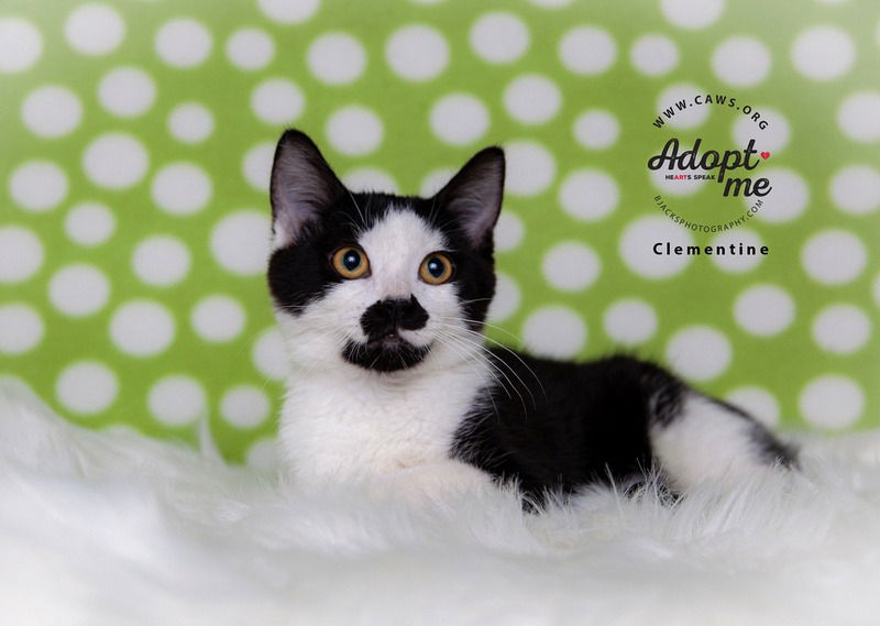 Clementine is an awesome kitty!. I’m silky soft With unique markings. She loves to be held, and is pretty much fearless.She is a real lap kitty.She loves to play with her toys and run around the house. She was named after the famous, bearded lady of yesteryear because she has a black mustache and beard. She needs a friend to play with. If you are interested in adopting a CAWS pet, please fill out an online application at https://caws.org/adoption-application