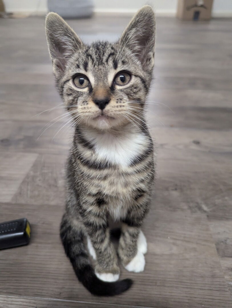 Cleo is a striking grey tabby, roughly three months old as of Nov. She is energetic and loves chasing a wire toy or wrestling with her brother Jack (adopted, 11/27), who follows her everywhere in the house. She can also be quite calm and snuggly, especially in the evenings, where she will curl up in a lap or lay beside one of our permanent cats. Cleo is playing in our Willow Grove PetSmart adoption center. Please submit our no-obligation application: https://forgottencats.org/adoption-application/. Thank you! (Foster: Benjamin B.).