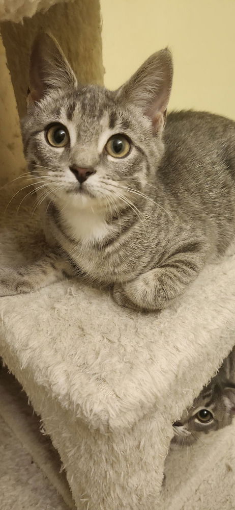 Meet Clover Clover is a soft gray beauty with a heart as gentle as her fur. She’s a super sweet little lady—shy at first, but once she feels safe, she blossoms into a loving, affectionate companion. Clover adores quiet cuddles, but she’s also playful and curious, ready to pounce on a toy or chase a feather wand.Clover is part of a bonded pair with her brother Sage, a sweet and easygoing gray tabby. These two bring out the best in each other—playing, snuggling, and giving each other comfort. They’re looking for a forever home together where they can keep sharing their special sibling bond.If you’ve been dreaming of double the love, double the purrs, and double the joy, Clover and Sage are waiting to meet you. If interested in adopting Clover and Sage, please submit an online adoption application and an adoption coordinator will contact you.