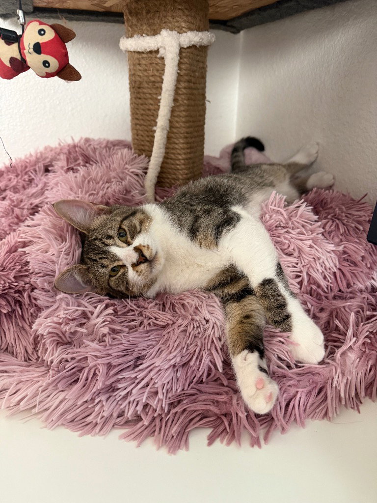 Cobee is a playful, big-hearted kitty who loves to climb, explore, and show off his adorable “air biscuits.” He gets along wonderfully with other cats—he’d especially enjoy having a feline buddy—and he does just fine around dogs, too. When meeting new people, Cobee might give a tiny hiss at first. It’s just his way of asking for a little time to feel safe. After a rough start in life, he can be a bit nervous initially, but he’s never aggressive—just understandably cautious. And really, who isn’t a little unsure around strangers? Once he warms up, Cobee’s true personality shines. He becomes an affectionate sweetheart who purrs nonstop and happily soaks up belly rubs and ear scratches. He’s also a big fan of wet food and Churu treats, and he’s always ready for playtime or cozy snuggles with someone he trusts. If you’re patient and looking for a fun, loving companion, Cobee is sure to steal your heart.To inquire about adopting this cat please complete an adoption application at tinyurl.com/ccapadoptions Once you submit an adoption application, a foster will reach out within 48 hours to schedule a meet-and-greet or ask any additional questions. If you haven’t heard back within that time, please contact **adoptions@sanantonioferalcats.org** so we can follow up. If the cat you’re interested in isn’t listed in the dropdown menu, it may be pending adoption or recently adopted, but the website hasn’t been updated yet. Feel free to email us for confirmation. Thank you for choosing to adopt one of our amazing cats!