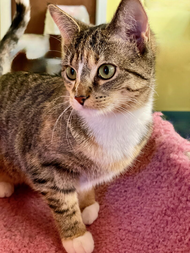 Coco has a big personality and is a purr machine! She is very affectionate and the first to start purring and begin playing when engaged. She's extremely gentle with kids and she]'s intelligent. She has the most beautiful tabby/calico coat with one orange striped sock on the front and back legs We want to make adopting easy for you! Here’s our application: https://form.jotform.com/232837730565159 Once you complete it, we’re on it! We’ll call your vet (or personal reference) the next business day. Then we like to do a brief video chat (FaceTime if you have it) so you can show us your new pet’s home – where they’ll sleep, eat, and play. During our chat, we can also give you tips or answer questions about how to successfully integrate your new family member into your household, especially if you have other pets. Our adoption fee is $150 and covers our costs of spay/neuter, vaccinations, vet exam, and supplies. (Once old enough, all our cats are current on their shots and have been spayed/neutered.) We’re a strictly no-kill shelter just for cats. We’re cage-free, donation-based, and volunteer-powered. We’re small but special and we’re glad you found us! For more info don’t hesitate to call or text us at 540-987-6050 or email us at adopt@rappcats.org.