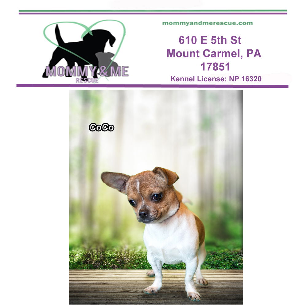 See CoCo’s HomepageGo to our official websiteYou can fill out an adoption application online on our official website.All adopters are required to meet at our rescue center in Mt Carmel, PA (no exceptions). Please EMAIL all questions to rescue.me.pa@gmail.com Please fill out an application here > https://mommyandmerescue.com/adoption-application/ and give your vet clinic permission to speak with us. Spayed/Neutered, UTD on vaccines, Chipped Adoption fee 400 You must submit the application and be approved prior to meeting one of our dogs. If you have questions please EMAIL rescue.me.pa@gmail.com or visit mommyandmerescue.com Kennel License: NP 16320 CoCo Chihuahua mix Female Weight : 8 pounds 2 yrs old CoCo is a shy but sweet girl. She loves other dogs, kids, and cats. CoCo is a snuggler. She is house-trained and crate-trained. She likes to be carried but can walk on a leash. License: NP 16320 PLEASE NOTE- we do not refund deposits if you change your mind. We are a PA licensed, 501C3 non-profit rescue. Visit our page for more information http://www.mommyandmerescue.com/