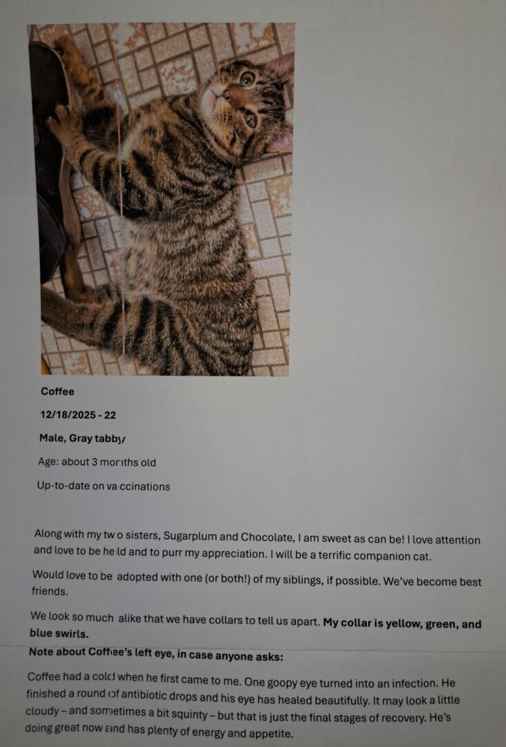 Please meet Coffee! He and his sister Chocolate are playing in our Brandywine PetSmart adoption center while awaiting you visit. As of March 2026, the sibs are about 5-6ish months old. Please stop on for a visit! Note: Sugarplum has been adopted. Please submit our no-obligation application for a meet and greet or to adopt: https://forgottencats.org/adoption-application/ . Thank you! (Foster: Deborah C.)
