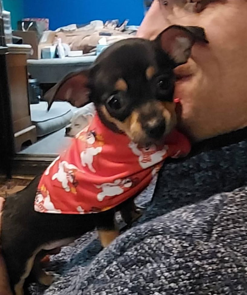 To apply to adopt this dog now, complete our adoption application HERE To see our upcoming events where you can meet some of our dogs, please see HERE Age: 3 months (as of 1/15/2025) Weight: 3.3 lbs (as of 1/13/25) Location: RI This dog has been spayed/neutered, is up to date on shots, on heartworm preventative and is microchipped. Introducing the three Amigos puppies! We have three handsome little (and we mean LITTLE!) boys – Conrad, Clifford, and Chet. They are all eager to find their new homes. We think these pups may be chihuahua mix, but your guess is as good as ours. Conrad comes from an active foster home where he has been living with two adults, 2 cats, 2 dogs, and a bird. Conrad’s foster family reports that he is an affectionate little dude who is outgoing and playful. He loves playing chase and bitey-mouth with his canine friends, and he also enjoys a chew toy or squeaky toy (he’s pint-sized, so they are too!). Is it naptime? Conrad is down for some cuddles on the sofa, and he definitely won’t turn down lap time with his people! Being so young, Conrad would love to find a family who has the time and patience to raise a puppy; he has so much to learn! He'll need house training, crate training and will need to learn to walk on a leash. We strongly recommend that all our dogs – and especially puppies – attend obedience classes because you get to learn commands together, it offers an opportunity for confidence building and socialization for the dog, and it also helps to strengthen that ever-important bond between the dog and his human family. It’s lots of fun, too! Puppies are a lot of work and require a strong commitment to teaching them obedience, socializing with other dogs and people, playing with them and loving them to pieces. It takes a lot of time, energy and patience to bring up a puppy and it’s totally worth it! If you're ready to make that awesome commitment to bring up Conrad, then fill out an application today! Wet puppy kisses and warm, furry snuggles are awaiting! Medical Note: This dog is being treated/has been treated for demodectic mange, a non-contagious skin condition. The dog has responded well to this treatment and is ready for adoption, though may still have some bald patches and/or thin fur in places. Please note that demodex can flare up in any dog in times of stress (eg, transport, transition to a new home, change in food, etc). As such, the adopter is advised to discuss this condition and best next steps with their veterinarian. SOS recommends that dogs with a history of demodectic mange be kept on regular NexGard or Bravecto for flea/tick prevention for at least 3 months after adoption for adults or until 18 months of age for puppies. Please see here for more information on demodectic mange, and talk with your Adoption Counselor about this condition. Please check with your vet if you have any questions or concerns about this medical history. An adoption donation is required for each adoption; please see HERE for more information about this. To apply for this dog, fill out an adoption application on our website: Adoption Application – SOS Animal Rescue League in Rhode Island (sosarl.org) **Additional info you should know – For most of our dogs, we are only guessing at predominant breed or breed mix. We get to know each of our dogs as an individual and do our best to describe and place them based on personality not by breed label. Some dogs may not yet be in New England, nor ready for immediate adoption. There may be additional vetting, quarantine, waiting periods and/or fees depending upon your state of residence. If you have questions or concerns on any of this, you can discuss this with your Adoption Counselor.