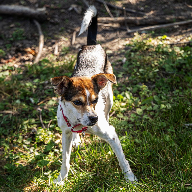 Are you searching for a dog to join your home that will be completely devoted and obsessed with you? Meet 2-year-old Cooper, a charming and energetic 15 lb. rat terrier mix just waiting to find his forever home! This handsome boy is a loyal, lively companion who thrives on outdoor walks and playtime. Whether it's chasing after his favorite ball, starting a tug-o-war with the smallest toy imaginable, or howling to get your attention, Cooper is always ready to do something fun with his humans. Cooper is house trained and walks really well on a leash. Although he does great with his dog friends, Cooper is picky about his canine companions. He needs a dog friend who can handle his rough-and-tumble play. Cooper loved playing with a fearless puppy in his foster home as well as another high energy rattie girl he met on a playdate, and has tried to make other friends with less success. He is often a bit too much for lower energy dogs. He is learning to respect the space of the middle-aged small dog in his foster home by gravitating more toward his human caretakers for play. The coolest thing about Cooper is that he loves training! He has proven excellent at training for tricks and he can now "sit", "down", "wait", "spin", "roll over", and "shake". The mental energy spent on training helps to keep Cooper focused and builds his confidence with you. Cooper’s challenge is that he really misses you when you leave the house and has big feelings about being at home without you. He has some separation anxiety that often results in some barking when left alone, especially upon your return, so he probably isn't ready for apartment living. This has gotten much better in the time he has spent in his foster home. While he can be reactive on walks, this has mostly resolved once he learned his new neighborhood. Adopters should be prepared to continue working with Cooper on these behaviors as he settles into a new home environment. If you want to learn more about Cooper’s charm and his big personality, check out his photo album at http://www.imageevent.com/newrattitude/cooper , then apply today! If you are interested in adopting this dog, PLEASE READ THE DETAILED ADOPTION PROCESS information on our website at www. NewRattitude.org/adopt/ From there, you can access our adoption application or contact our Adoption Team for more info.