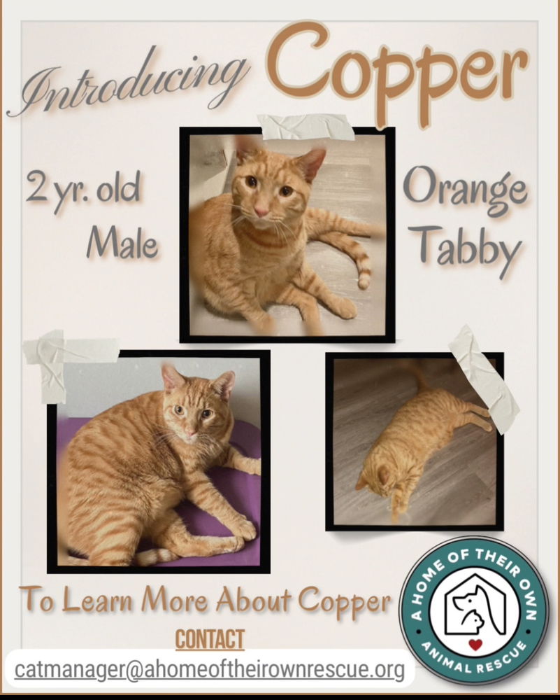 Copper is a handsome orange fellow and he's looking for a soft place to land. Copper's story is a reminder of how much love and loyalty our pets give – and how sometimes, life changes faster than we like. Copper has been deeply loved and cared for, and it shows. He is affectionate, playful and happiest when he is close to his people. Copper is 2 years old and 16 pounds of love. He is fully vetted, vaccinated, microchipped and neutered. He loves people and we believe he will adjust quickly to his new home. His adoption fee is $150. If interested in Copper, you can apply at https://www.ahomeoftheirownrescue.org/cats/ or email catmanager@ahomeoftheirownrescue.org.