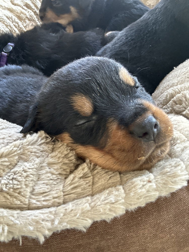 Meet Cosmo, the adorable Purebred male Rottweiler puppy born on February 17, 2025! With his charming parents, Sol and Luna, also in our rescue, Cosmo is already stealing hearts, and he’s just getting started! Although he won’t be ready to go home until he turns 8 weeks old, we are now accepting applications for him and his brothers. We want to find the perfect match for Cosmo, so we'll carefully review each application to ensure he goes to the best home possible!Just a week ago, Cosmo opened his eyes, and each day brings new personality traits to discover. With his dad boasting a striking block head and his beautiful mom by his side, Cosmo is sure to inherit those stunning looks—he’s already starting to resemble his father! Their heads are so big, it’s like they stepped right out of a cartoon!**Our Adoption Process:** If you’re excited about welcoming one of our fun-loving, not-so-rotten Rotties into your family, we invite you to fill out our questionnaire! You can find it on our website, www.rottenrottie.com, under the forms tab. This helps us get to know you better and ensures that the dog you’re interested in is a great fit for your lifestyle. After reviewing your answers, if we feel Cosmo isn’t the right match, we may suggest another Rottweiler companion that better suits your family.Once we’ve found the perfect match, we’ll set up a meet-and-greet at the dog’s home, where they’ll feel most comfortable. A home check is required to ensure a safe environment for our pups. To finalize the adoption, we’ll sign a contract and ask for a rehoming fee of $500 for most adults and $350 for seniors aged 6 years and above. Our puppy fees can vary based on their needs and whether they’re purebred or mixed. These fees help support our mission to rehome Rottweilers, ensuring every dog is sterilized, fully vaccinated, microchipped, heartworm tested negative, and comes with a collar and a leash.Please note that we don’t adopt to out-of-state applicants,