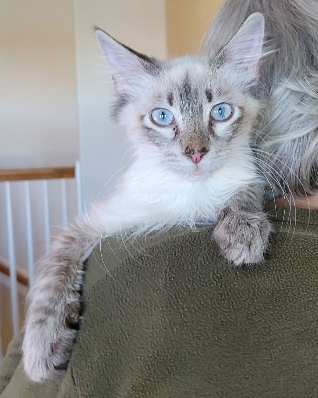 My name is Cozmo and I just love, love, love people. The problem is that they can be a little scary at first until you get to know them. But once I've made a friend I like to sit with them and purr, purr, purr. Dogs can be a little scary at first too, but once I got to know my two doggies sisters, I was fine with them. I am a quiet kitten who just wants to lead a nice cozy life with a family I can love! My adoption fee is $200.