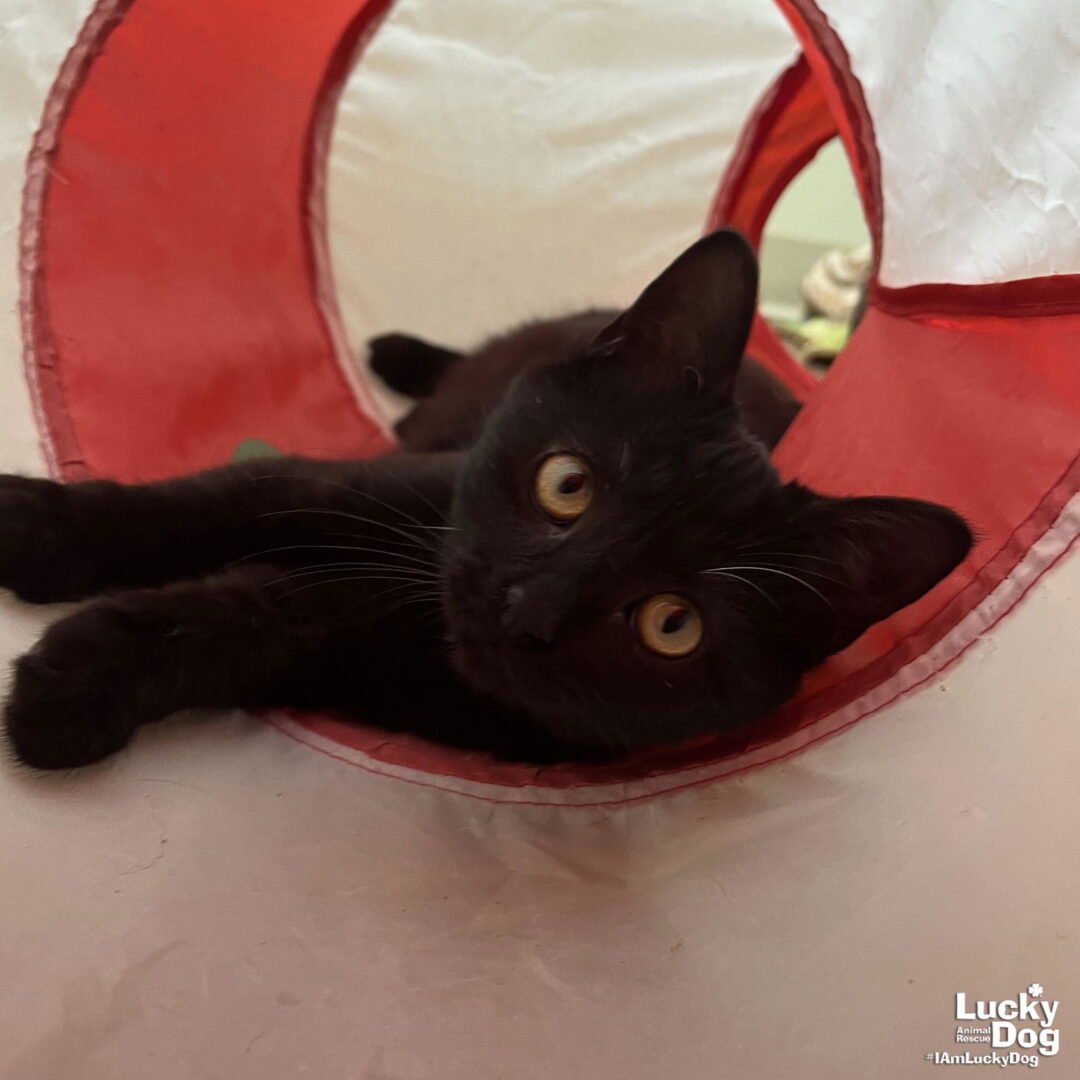 Please contact Lauren McCarty (laurenmc@luckydoganimalrescue.org) for more information about this pet.Baby house panther ISO a forever family!CRANBERRY NEEDS A FOREVER HOME! Name: Cranberry Best Guess for Breed: Domestic Short Hair Age: 10 weeks Estimated DOB: 9/27/24 SEX: Female Approximate Weight: 3.3lbs Coloring: Black Type of Hair: Short Gets Along With: Because of her young age, Cranberry will likely get along with other cats, dogs and kids with an acclimation period. We’re happy to help with tips and tricks! Litter: Cornucopia, Cornbread, Chesnut, Cranberry Currently Living at: Shelter — Coming to the DC area soon! I am Looking For: My loving forever family! Hi! I’m Cranberry, and I am a cute little kitten! I won’t ask for much- just some love, cuddles and lots of toys so I can run and play and be my kitten self. Two cats are more fun that one, and I’d love to be adopted with my super cute siblings! What my Foster Says About Me: Coming soon! Kitten Vetting Requirements: Your kitten may not be fully vaccinated upon adoption. You will be responsible for providing whatever remaining vaccines are needed to complete the kitten vaccine series. TO ADOPT: The adoption fee for adult cats is $200 ($350 for two cats adopted together). The adoption fee for a kitten (under 7 months old) is $220 ($380 for two kittens adopted together).If you are interested in adopting, please complete the Adoption Questionnaire online at bit.ly/adoptaluckycat. Lucky Dog Animal Rescue does our best to provide accurate information about the cats we have for adoption. That said, we cannot make any guarantees about age, breed or temperament. Thank you for contacting Lucky Dog Animal Rescue and helping to save a life! Please visit us online at www.luckydoganimalrescue.org . BE A FOSTER!!! Fosters make it possible for Lucky Dog Animal Rescue to save and care for homeless and abandoned dogs! To learn about fostering, please contact fostering@luckydoganimalrescue.org BE A SPONSOR!!!! Sponsors help Lucky Dog support the many dogs we save. To learn more about sponsorship, please contact info@luckydoganimalrescue.org !