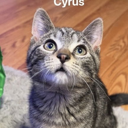 Meet Cyrus! A social butterfly with a calm and gentle demeanor, Cyrus enjoys playing with string and feather toys, as well as interacting with his sister Cleo. He has a sticky grip superpower, always holding on and not wanting to let go. Cyrus is a cuddle lover and loves spending time on his families lap. Cyrus thrives in a household where he can have both human company and quiet alone time, especially when cuddling with his sister Cleo. He's good with children and enjoys the presence of other pets, being a friendly and affectionate feline. He loves his sister and would love to be adopted into a home where he can enjoy the rest of his life with his best friend.Cyrus quirky trait is fascinated by running water and loves to watch it flow. He fell into a sink once while the water was running he loves it that much! Cyrus's favorite activities involve playing with toys on a stick and string, a surefire way to keep him entertained and happy.Just like you, Cyrus needs his rest. Whether it's snuggled under a blanket with his head on a pillow or just peeking out, he knows the importance of a good night's sleep.If you're looking for a sweet and playful companion who loves cuddles and quality time with his feline sibling, Cyrus could be the purrfect addition to your family. He would bring and discover the joy of having this charming little guy in your life!WE DO NOT HAVE A PHYSICAL LOCATION AS WE ARE A FOSTER-BASED ORGANIZATION. PLEASE SUBMIT AN APPLICATION TO BE IMMEDIATELY CONNECTED TO A SCREENER.Apply at online application (catsfff.org/adopt)View all of our adoptable cats here (catsfff.org/cats)Our adoption fees are listed here (catsfff.org/adoption-fees)