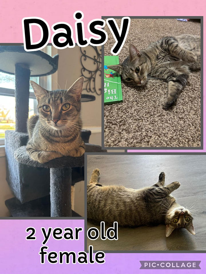 I have a spay appointment on 4/4 and can go to my new home after. My adoption fee is $120 which covers my annual feline distemper booster, rabies, and being spayed/neutered. Daisy is the sweetest mommy cat. Now that she is done raising her babies, she is ready to be pampered and treated like her babies! She is a dominate cat and needs to be an only cat or possibly a slow introduction with a younger cat so she can be the queen of the house. She does not do well with dogs who get in her space and want to play. If you have an older dog or calm dog who won’t pay her any attention, she should be ok with them! She is a very affectionate cat and wants all the attention! She is litter box trained and great with kids of all ages.