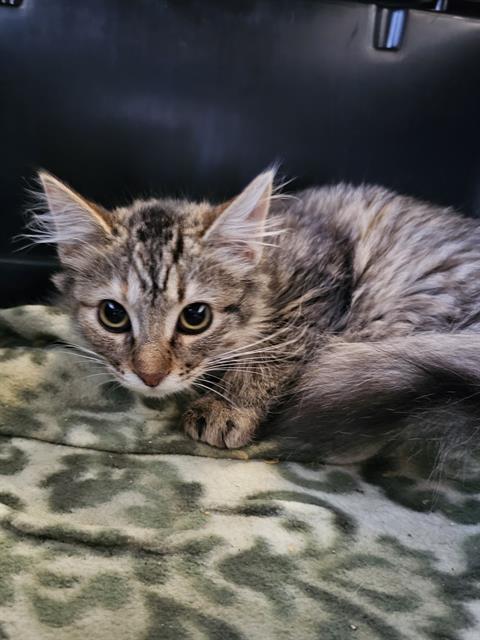 Debra Jo is a sweet young kitty who is caught between two worlds. She was born wild, and a well-meaning person brought her indoors, however they did not socialize her. She’s never been around people, even though she’s been indoors her whole life. She cannot be an outdoor cat now, because she would have no idea how to survive outside. She is not used to people, though. She finds us frightening, so she needs a special home. If you have experience socializing very timid cats, you would be the perfect home for her. She is still young, so it may be possible to domesticate her (in fact she already allows some petting). If you are willing to take her home, and be very patient with her you can make her into the loving kitty she was meant to be. Come by the shelter and meet her. We’d love to find a forever home for this special little girl.