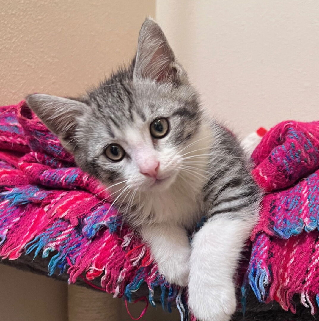 See Delbert’s HomepageGo to our official websiteYou can fill out an adoption application online on our official website. Give our cats & kittens a loving, forever home, and let them put a smile on your face! Delbert (born September 2024) is a sweet fluff-ball who needs a loving home. His coat is dramatic with black and white stripes like an exotic tiny tiger! He is inquisitive, athletic, and silly sweet. Delbert seeks every opportunity to explore his surroundings, but when resting in your arms he purrs and purrs. Delbert follows you around with his expressive face asking to play. How can you resist? Delbert loves scratching posts, batting and chasing kitty balls (he’s a soccer star), and playing interactively with a wand toy. Delbert likes to jump up and meet you at eye level requesting attention. This guy wants to hang out with you as you work on your laptop, and stare at you lovingly. He is also a little rascal and will play with your pencils, batting them to the floor! But he is easily redirected with soft kick toys. Delbert loves to wrestle, and a feline buddy to roll around with would be welcome for his kitten energy. A people cat – Delbert is always following, climbing up on, and wondering what you are up to. Little Delbert is trying to figure out his place in the world and would love a warm sofa and lap to call home.