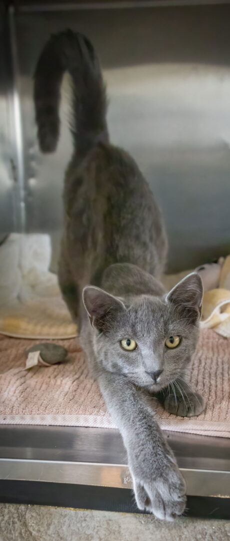 I am scheduled to be at the adoption event in the Brandywine PetSmart Nov. 22-24. Please ask to meet me. Thank you! This handsome, affectionate boy is Dennis! Introducing Dennis, the striking gray kitty with a vocal personality and a flair for affection! This handsome boy loves to stretch out and show off his long, lean back and fluffy tail—he knows how to make an impression! With his stunning charcoal gray coat and golden eyes that truly pop, Dennis is a sight to behold. But it’s not just his looks that will win you over—Dennis is also incredibly affectionate. He’ll do anything to have his paw hold your hand, showing just how much he craves love and attention. If you’re searching for a dashing kitty who will charm you with his sweet paw-holding and gorgeous good looks, Dennis is the perfect match. Come meet this vocal, affectionate guy today and let his golden eyes and loving nature light up your home! Dennis is playing in our Trainer, PA clinic/shelter and would love to be in a loving home. Please submit our no-obligation Adoption Application to meet and greet or to adopt: https://forgottencats.org/adoption-application/. Not ready to adopt? Please consider fostering: https://forgottencats.org/foster-a-cat/. Thank you! (Foster: Trainer)