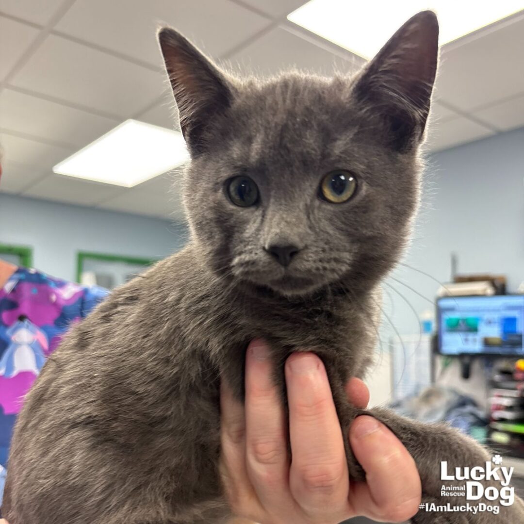 Handsome boy in search of his forever home!DESMOND NEEDS A FOREVER HOME! Name: Desmond Best Guess for Breed: Domestic Short Hair Age: 12 weeks as of 11/29/25 Est. DOB: 8/29/25 SEX: Male Weight: 3lbs 13 oz Coloring: Gray Type of Hair: Short Lives with: David, Desmond, Dal, Dallon Gets Along With: Because of his young age, Desmond will likely get along with other cats, dogs and kids with an acclimation period. We’re happy to help with tips and tricks! Currently Living at: Shelter – coming to the DC area soon! I am Looking For: My loving forever family! Hi! I’m Desmond, and I am a cute little kitten! I won’t ask for much- just some love, cuddles and lots of toys so I can run and play and be my kitten self. What my Foster Says About Me: Coming soon! Kitten Vetting Requirements: Your kitten may not be fully vaccinated upon adoption. You will be responsible for providing whatever remaining vaccines are needed to complete the kitten vaccine series. Due to this kitten’s young age, she/he has not yet been spayed or neutered. As part of the adoption contract, it will be your responsibility, as the adopter, to ensure that this is done no later than 3/1/26. There are NO EXCEPTIONS and NO EXTENSIONS to this date. A non-refundable spay/neuter deposit will be collected if you would like Lucky Dog to pay for this animal to be spayed/neutered at one of our low-cost partner vets. TO ADOPT: The adoption fee for adult cats is $200 ($350 for two cats adopted together). The adoption fee for a kitten (under 7 months old) is $220 ($380 for two kittens adopted together).If you are interested in adopting, please complete the Adoption Questionnaire online at bit.ly/adoptaluckycat. Lucky Dog Animal Rescue does our best to provide accurate information about the cats we have for adoption. That said, we cannot make any guarantees about age, breed or temperament. Thank you for contacting Lucky Dog Animal Rescue and helping to save a life! Please visit us online at www.luckydoganimalrescue.org . BE A FOSTER!!! Fosters make it possible for Lucky Dog Animal Rescue to save and care for homeless and abandoned dogs! To learn about fostering, please contact fostering@luckydoganimalrescue.org BE A SPONSOR!!!! Sponsors help Lucky Dog support the many dogs we save. To learn more about sponsorship, please contact info@luckydoganimalrescue.org !