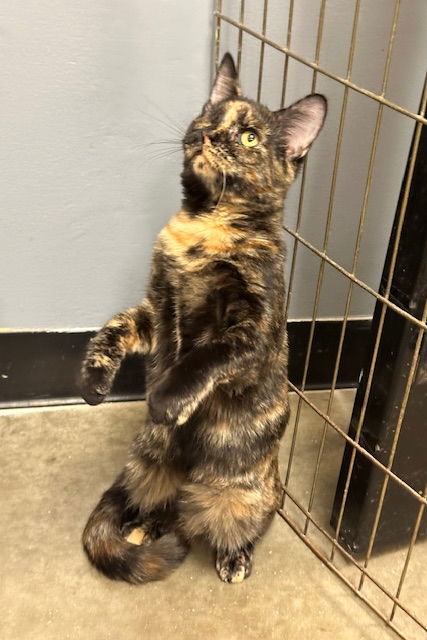 Dolly is a sweet tortie female DSH. Dolly came to FC with an injured eye that had to be removed. She doesn’t let that slow her down- she loves to play but is on the calmer side. She is a little cautious but warms up quickly. She immediately starts purring when you cuddle her. Dolly is a very gentle easy-going kitten. Dolly was about 4 months old at the end of August. She was playing with her sister Kiwi (FCID# 07/28/2025 – 62) and their foster family. Dolly is now playing in our Brandywime PetSmart adoption center. Please ask to play with her! Please submit our no-obligation adoption application for a meet and greet or to adopt: https://forgottencats.org/adoption-application/ . Thank you! (Foster: Kelly W.)