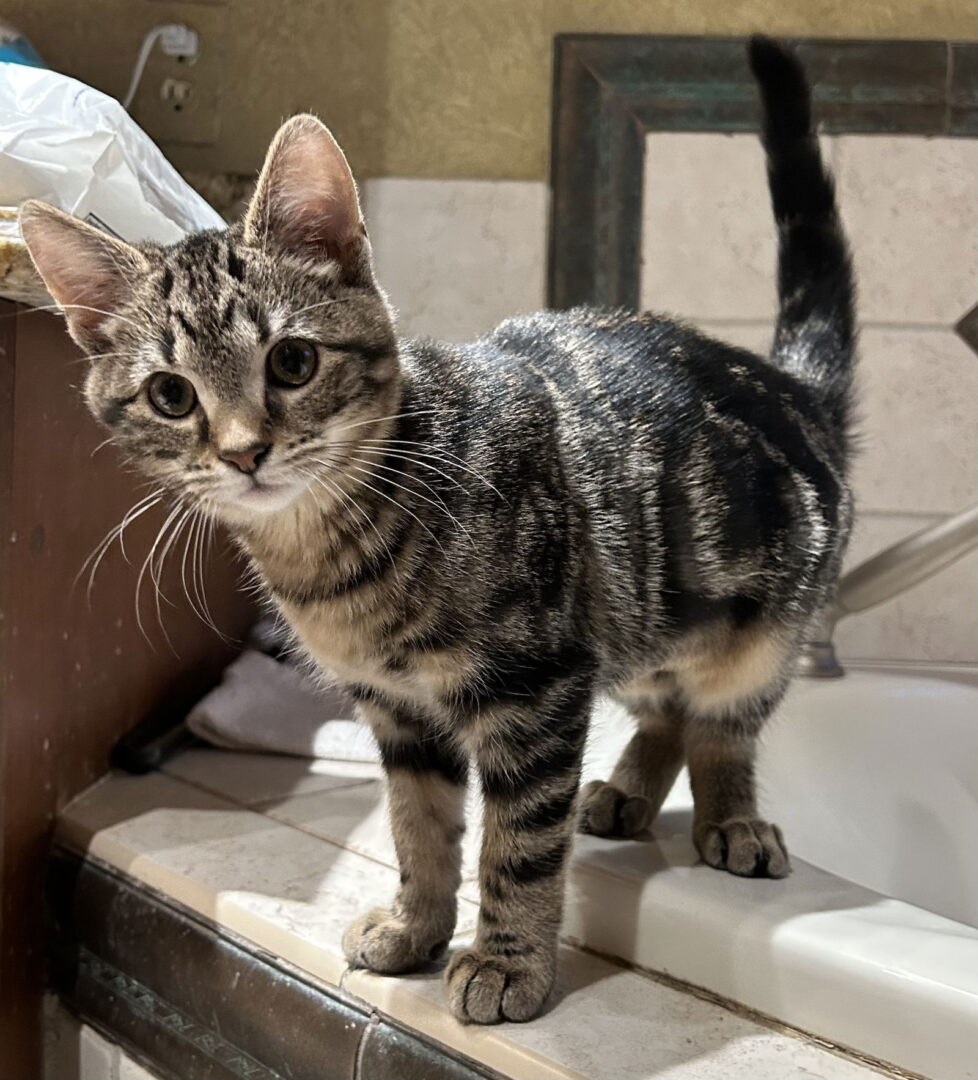 SO ADORABLE!!! Dorothy (tabby) and Elaine (Russian blue mix) are 6 month old sisters, very bonded, so we would like to keep them together. Their foster mom got Dorothy and her litter mate Elaine at 3 days old. Bottle fed until old enough to eat on their own. Super cuddly because they were handled so much as babies. Elaine is the more shy of the two but also likes to be cuddled. Tested, spayed, shots, microchips. Adoption fee $150 for the pair. Email marla@adopt-a-kitty.org or text 251-404-0022