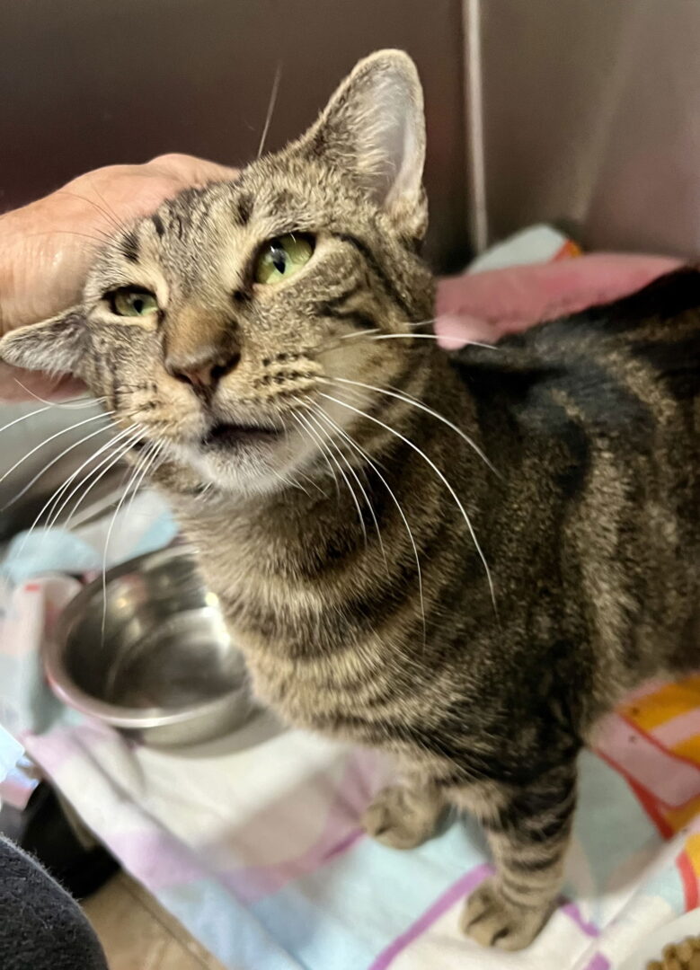 Could you foster sweet Dot? Meet beautiful tabby Dot! You will love her striking green eyes and loving nature. When I met Dot, she immediately stepped toward me and enjoyed lots of pets and kind attention. Check out her video: https://www.youtube.com/shorts/xkifhSwmcA4 . Please submit our no-obligation Adoption Application for a meet and greet or to adopt: https://forgottencats.org/adoption-application/. Not ready to adopt? Please consider fostering: https://forgottencats.org/foster-a-cat/. Thank you! (Foster: Trainer)