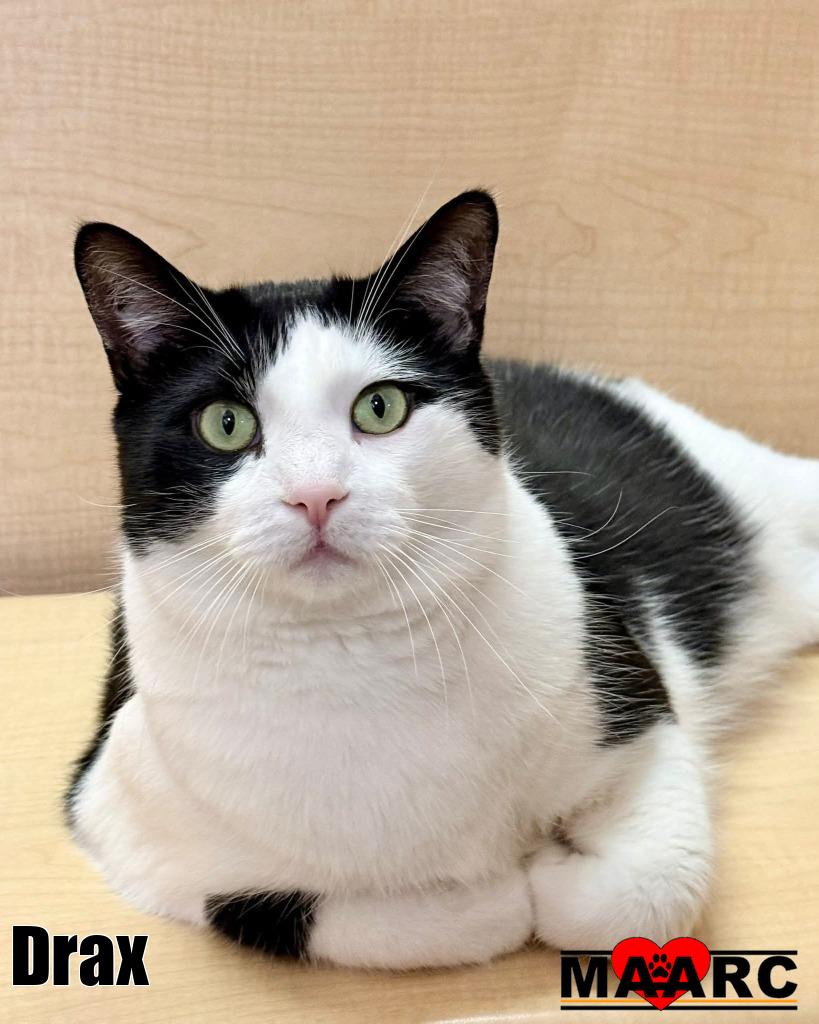 Drax is an 18-pound black and white gentleman with a big presence and an even bigger heart. Don’t let his size fool you—this lovable guy is all about affection. He’s incredibly friendly, always ready to greet you, and happiest when he’s curled up close, soaking in all the cuddles he can get.Drax is also quite the conversationalist. He loves to “chat” with his people, whether he’s asking for attention, sharing his thoughts on the day, or reminding you it’s time for more pets. His expressive personality makes him a constant and endearing companion.Despite his larger-than-life stature, Drax is easygoing and gets along well with other cats, making him a great addition to a multi-cat home. If you’re looking for a sweet, snuggly, talkative best friend, Drax is ready to fill that role—and your lap.