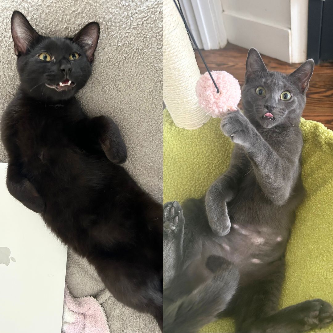 Meet the iconic duo: Piper (gray, F) and Dreamer (black, M)! These two kitties are the cutest best friends, and are never seen more than a few feet away from each other. They love to get up to all sorts of mischief, chasing each other around, stealing hair ties, and curling up under blankets together. Both are very social and affectionate. Dreamer loves to be held and will go completely boneless when pet. Piper is a bit more independent and will let you know when she wants to cuddle. These sweet babies would do best in a social home with people who love to play and cuddle as much as they do!