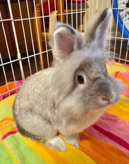 Dresdan is a delightful lion head mix male. His love for food has lead him to learn numerous tricks for a treat. He knows stand up and walk, turn around in circles (both directions), jump through a hoop, step up, give a kiss, follow and boop the snoot. His intellect requires quality enrichment time spent with him to practice tricks. He will solve any puzzle toy you place in front of him and is a little escape artist if his enclosure isn’t secure. He is well socialized, growing acclimated to being picked up and held, likes pets and rubs and short snuggles, loves being talked to and will wink in response. A very personable little man. He wants to be a single rabbit. neutered. dob 9-25-24