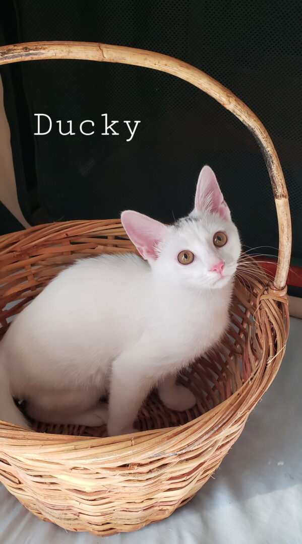 Ducky was rescued from living outside as a tiny baby along with her siblings and mama. The babies were struggling so we are very thankful we were able to help them! The litter was so very small but they have blossomed in their foster home and will never remember trying to survive outside. Ducky is super sweet and playful, a wonderful purr baby. The entire group is super social and love people. Seeing them thrive makes our hearts happy. We would love for her to be adopted with her sister Pixie as kittens do best in pairs. Bedhead, Cowlick, Shaggy and Paige are cousins bring fostered in the same home. Are you the lucky family to adopt these sweet girls? Her apprx birthdate is July 11, 2025 She is microchipped, vaccinated, combo tested negative for fiv/felv & spayed. Adoption fee is $75. or 2 for $125. Please fill out the application and answer all questions completely if you are interested in adopting! here is a link! https://www.pfcatrescue.org/adoption-application/