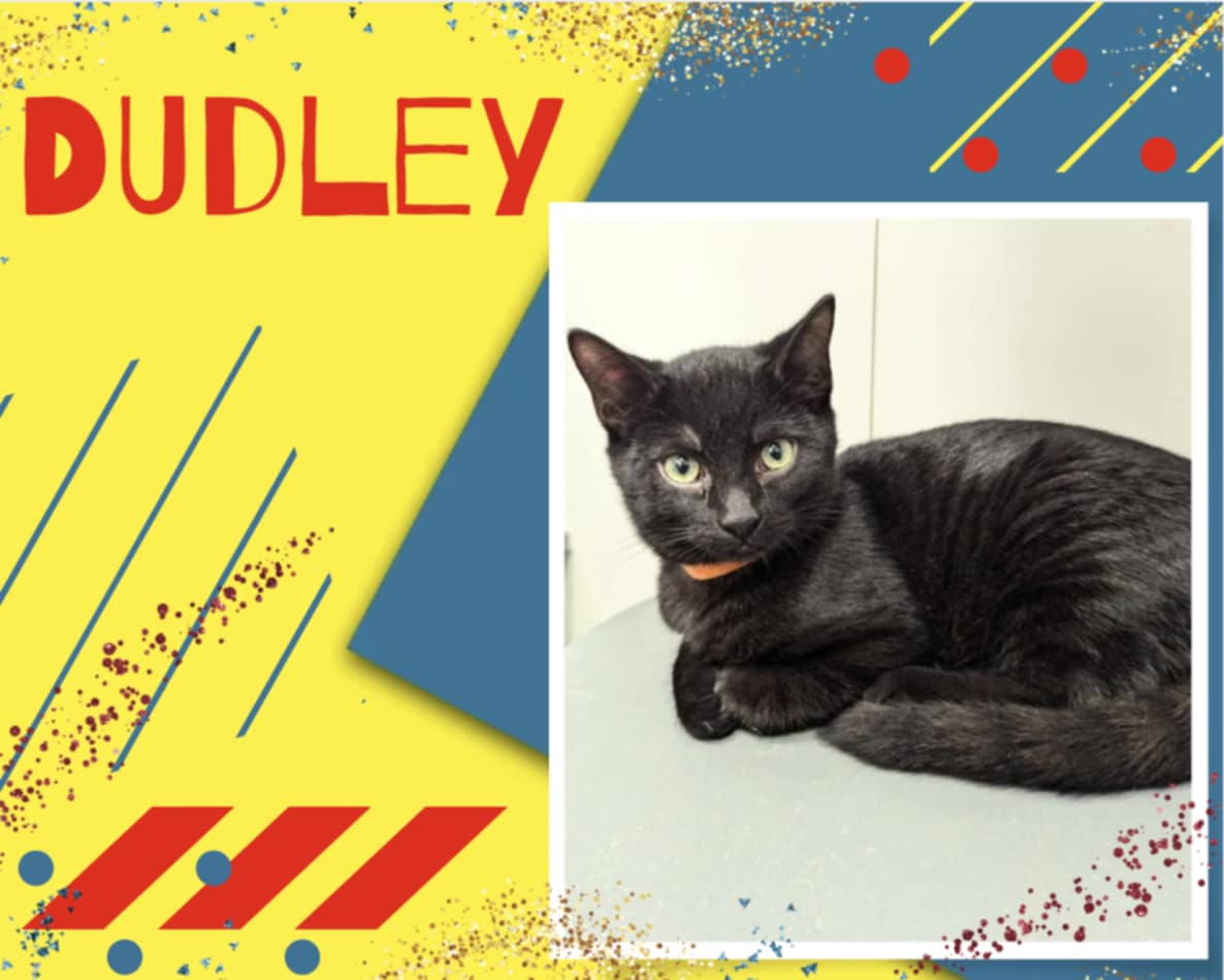 DUDLEY – DSH, male, neutered, black, DOB June 15/24 Dudley is very sweet, loving and gentle. He would do best in a mature, quiet home.