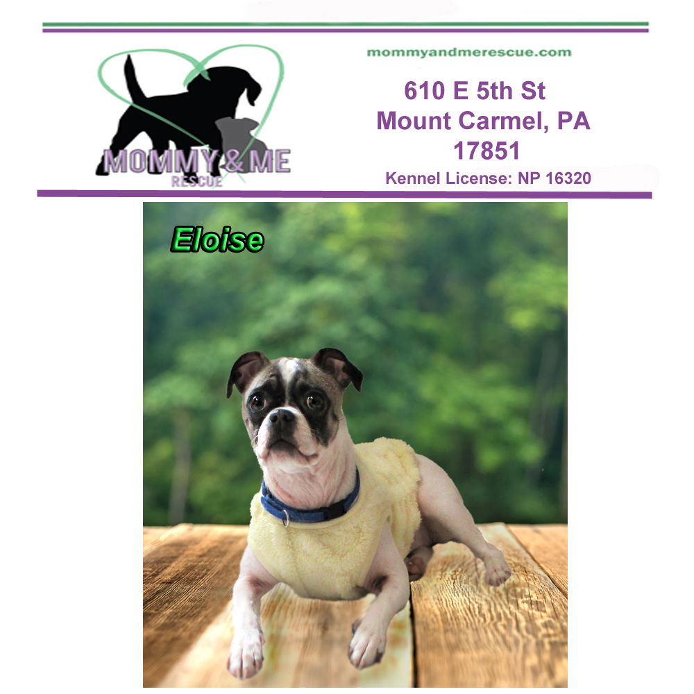 See Eloise’s HomepageGo to our official websiteYou can fill out an adoption application online on our official website.All adopters are required to meet at our rescue center in Mt Carmel, PA (no exceptions). Please EMAIL all questions to rescue.me.pa@gmail.com Please fill out an application here > https://mommyandmerescue.com/adoption-application/ and give your vet clinic permission to speak with us. Spayed/Neutered, UTD on vaccines, Chipped Adoption fee 400 You must submit the application and be approved prior to meeting one of our dogs. If you have questions please EMAIL rescue.me.pa@gmail.com or visit mommyandmerescue.com Kennel License: NP 16320 Eloise Pug Mix Weight : 12lbs DOB: 11-25-22 Eloise is a 12 pound, 2 ½ yr old bouncy, fun-loving, adorable little girl. She was owner surrender because they could no longer care for her. Eloise likes other dogs but can be possessive of food.She does love playing with other dogs. Eloise likes kids over the age of 10. Eloise is house-trained and crate-trained. She loves squeaky toys. Eloise was trained at FIDOS SCI Coal Township and knows the following: Stay Leave it Sit Lap Down Come Touch License: NP 16320 PLEASE NOTE- we do not refund deposits if you change your mind. We are a PA licensed, 501C3 non-profit rescue. Visit our page for more information http://www.mommyandmerescue.com/
