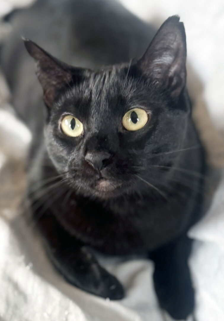 Elvira is a goofy kitty with a silky soft black coat and a big personality. She will keep you entertained with her silly antics and zoomies. Petite with a little extra around the middle, she has a deep appreciation for food and will appear immediately if treats come out. Her legs are quite short so she is low to the ground and very cute. She is affectionate and loves to be held, loved, cuddled, and petted, but may be a little shy initially. She is big into purrs and making biscuits. Elvira would be ok with another gentle cat or as an only pet. She would do well in a house with adults only or with cat savvy teens and may accept a mellow dog. We estimate Elvira was born in early June of 2024. Kitty Bio #581LRoEl. ▶️ scroll down for clip If you're interested in adopting Elvira or another of our cats, please fill out our adoption questionnaire at https://icraeastbay.org/adopt/how-to/.