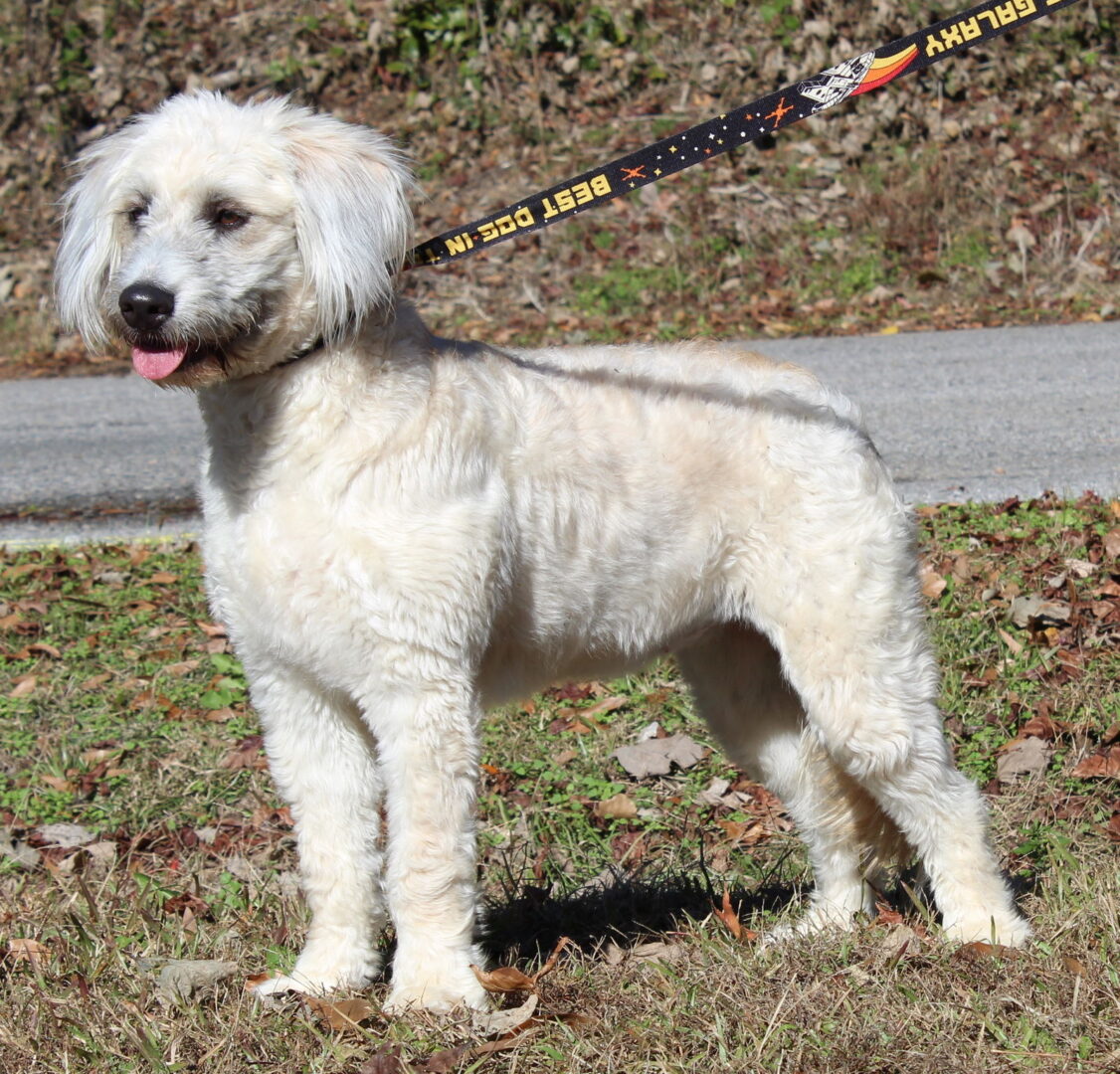 Ember (Em or Emmy) is an 1-year-old Vizsladoodle (Vizsla/Poodle). She was turned in by her elderly owner because she was too active and strong for her. Emmy is white and has been recently groomed in her pictures. This magnificent dog weighs 58 pounds so she is considered to be a large dog. Emmy is treat motivated, loves peanut butter (who doesn’t?), and knows the commands ‘sit, down’. She is both house trained and leash trained. Emmy would be good with older children due to her activity level and the fact she does not like sudden movements. She is a very timid dog who must be approached slowly until you gain her trust. Emmy is good with other dogs; and we would like to see her placed in a home with another dog she is compatible with. She is afraid of men; and we will be very careful about placing her in a home with men. We are not ruling out men in the home; but it will have to be someone who Emmy will bond with and trust. This is an exquisite young dog who is going to make someone a truly amazing new family member.Dog/puppy adoption fees are $100. Cat/kitten adoption fees are $50.