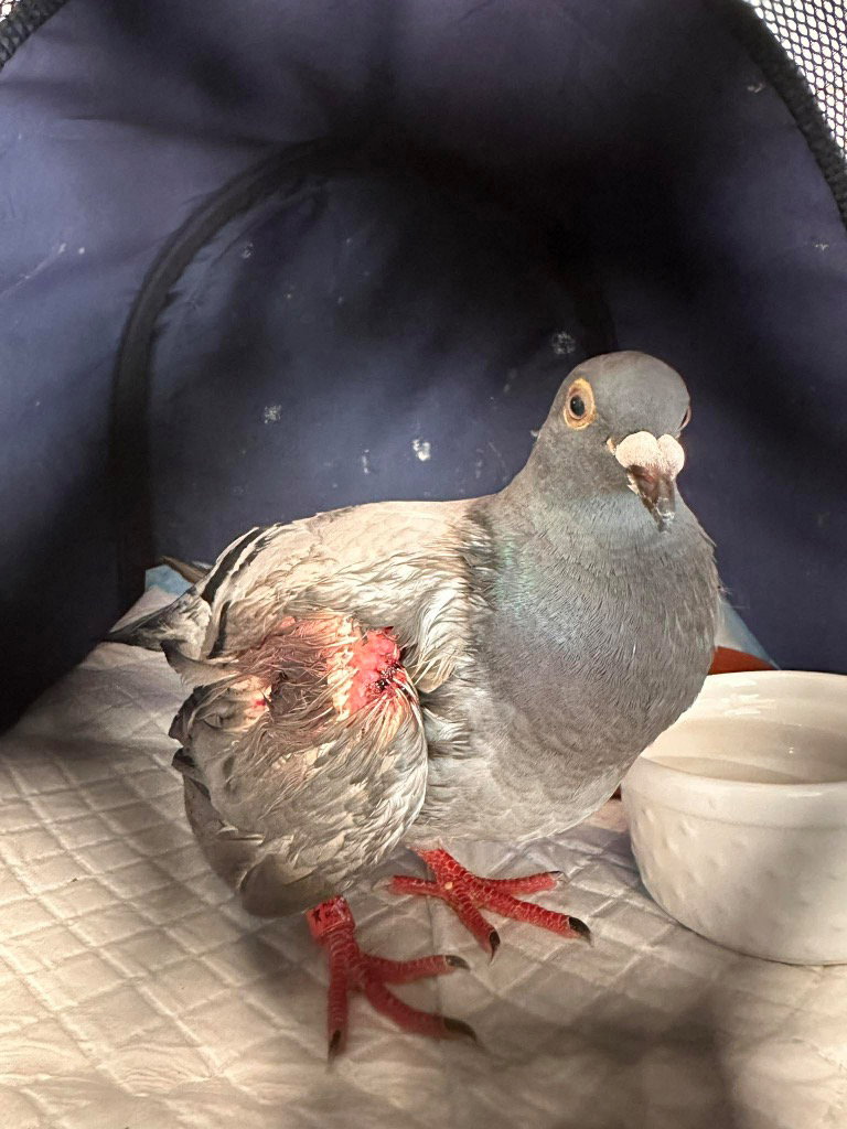 Emily is a survivor of the cruel ‘sport’ of pigeon racing. She self-rescued onto a front porch in Orinda and the kind lady who lived there posted to the Palomacy Facebook Help Group and we picked her up and got her the medical care she needed (two puncture wounds that needed to be cleaned, sutured, and bandaged). This bird is so incredibly sweet – she was preening Jill as Dr. Galusha cleaned her wounds. We will have more details about her in the coming weeks.Please apply to adopt http://www.pigeonrescue.org/birds/apply-to-foster-or-adopt/