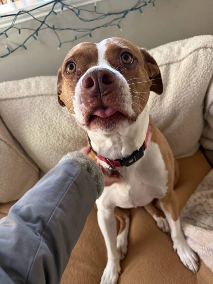 See Emma’s HomepageGo to our official websiteYou can fill out an adoption application online on our official website. Online Adoption Application › Hi there! I’m a sweet, wiggly pitbull girl looking for my forever home. I may not have had the easiest start, but you’d never know it from my big smile and my ever-wagging tail. I’m currently living with a wonderful foster family who tells me every day that I’m smart, brave, strong, and good—and I believe them!I’m the perfect mix of snuggly and playful. If you’re looking for a couch companion, I’m your girl—nothing makes me happier than curling up beside my people. But when it’s time to play? I’m all in! tug-o-war, walks, exploring the yard, car rides—I love it all. Training: Emma has mastered basic commands such as sit and stay. Emma is a quick learner and would thrive in a home that continues to provide consistent positive reinforcement and mental stimulation. Health: Emma up to date on all her vaccines but does suffer from allergies. Her allergies are well controlled using Benadryl or Zyrtec and specific food. Ideal Home: Emma is looking for a loving forever home that can provide her with the attention and affection she deserves. A family or individual who can dedicate time to her physical and mental exercise needs would be perfect. While Emma is comfortable in various living environments, a home with a securely fenced yard would allow her to safely enjoy outdoor activities. No cats. No young children – not that she doesn’t love kids, but she wants all their toys as her own. ❤️ What I’m Good At Giving the BEST kisses Snuggling Learning new things—I’m smart, eager, and love treats I’m crate trained and house trained If you’re looking for a devoted companion with a big heart and an even bigger smile, I might just be the girl for you. I can’t wait to meet my person—could it be you?