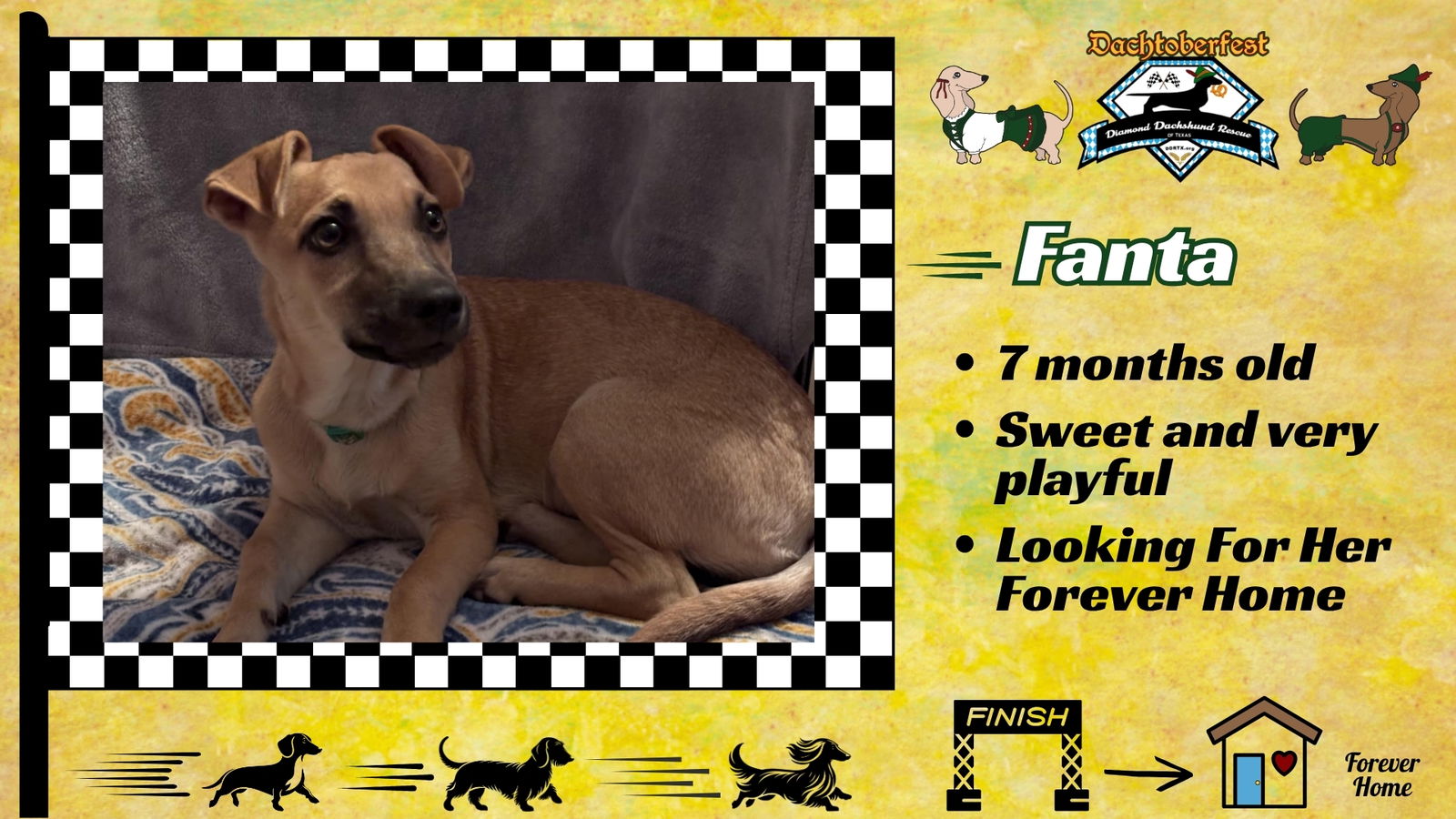 See Fanta Orange’s HomepageGo to our official websiteWelcome to the Wonderful World of Rescue Dachshunds. Look around and read their bios. Find a few whose personality seems to fit well. Consider one of our Well Seasoned Seniors who are truly wonderful and have so much to offer. Need help finding the best fit? We'll help with that too. Please fill out an application and let’s get you all matched up with a loving new “furever’ companion and friend. You’ll find the application on the “Available Dogs” page. NOTE: Adoptions to Central/South Texas residents only Please see FAQs for current adoption fees. DDRTX only adopts in Central/South Texas. Email: ddrtxinfo@gmail.com Primary Website: www.DDRTX.org Puppy #2 of 4 – Momma is Honey Bea Fanta Orange is one of the Soda Pop Pups. She was in a shelter with her mom, Honey Bea and brother, Barq’s Root Beer and sister, Ginger Ale. She has light red smooth fur and a black muzzle. She weighs about 12 lbs. She was probably born in March of this year. Fanta is a sweet, shy girl. She loves playing with the dogs in her fosters home. She loves toys, Especially the squeaky kind! Fanta has fun chasing around the yard with all the other dogs! Fanta loves to lay on your lap or beside you for naps!! She will roll over on her back so her belly can be rubbed. She sleeps in a doggy bed beside the big bed. Fanta eats really fast so a slow feeder is best for her. Love dachshunds and not ready to adopt or circumstances won't permit having a dog? How about being a sponsor or making a donation. Every one of our dachshunds receives excellent medical care along with day to day food, love and housing. Being non-profit, we rely on generous individuals like yourselves to help save these fur babies. You can do this specifically for one dog with the sponsor button on their webpage or a general donation on our “How To Help” page. Easy and quick through Pay Pal or your debit/credit card. You generosity is sincerely appreciated by all and is tax deductable. Need other ideas? You'll find tons of them on the How to Help tab. All contributions are tax deductable. Diamond Dachshund Rescue of Texas is a non-profit 501(c)(3) volunteer organization with focus on rescue and adoption of pure breed Dachshunds. All dogs are fully vetted and housed on private property. Meetings are scheduled upon adoption approval. Thank you for your continued support to the rescue and shelter communities! Opt to Adopt!