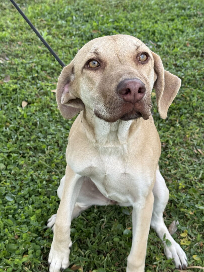See Farrah’s HomepageGo to our official websiteYou can fill out an adoption application online on our official website.Farrah was surrendered to PRBJ because her family was unable to care for her any longer. She is sweet hound mix with beautiful eyes to match her lovely blonde coat. She is loving and affectionate. Farrah was not leash trained and is now learning that the leash means adventures. She is looking for a home with a nice yard and a person or family that will give her lots of attention and spend time playing and socializing her. Farrah is a sweet soul that will need a patient and understanding owner to help her learn to be a dog. New puppy parents must be dedicated to obedience, socialization and potty training to ensure the pup grows up to be a happy and well-adjusted dog. We recommend the ENTIRE family attend puppy training classes. This ensures that all family member are using the same commands and techniques. Please note a fenced yard is preferred for this baby to romp and safely play.
