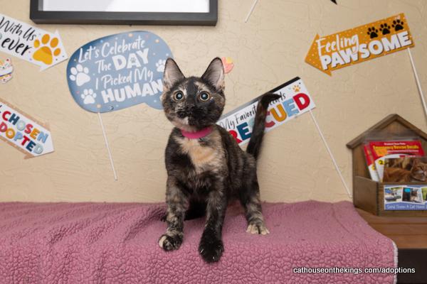 Two bonded tortoiseshell “twin” sisters came into the world looking pawsitively celestial-inspired! Sweethearts Fawn and Faith have that classic mystical tortie look in their beautiful dark coats, dark as a deep night sky, highlighted by brushstrokes of golden starlight. Even their fuzzy golden chins are a mirror image! While they enjoy their other sisters and get along with dogs, they play especially energetically with each other, are often found cozily snoozing together, and don’t like to be apart in separate rooms. Fawn is more the adventurous spirit while Faith is more the lovebug, but both girlies readily come to you to be cuddled on your chest and nap if you have time. They are destined to be beautiful, happy, deeply affectionate and loyal companions and would love to be able to stay together. Fawn hopes you choose her, especially if you chose Faith too! Please note:Fawn is ok with dogs For more information & an online application go to https://www.cathouseonthekings.com/adoption/cat.php?id=26917&ts=1761721409&src=rg
