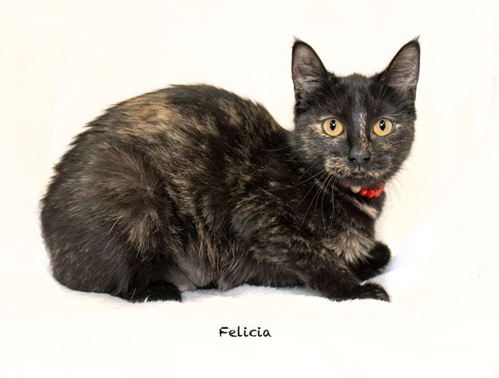 Meet Felicia, a beautiful dark tortoiseshell kitten with a personality as striking as her coat. She’s curious, confident, and full of kitten energy—always ready to play, pounce, and explore. Beneath that lively spirit is a sweet girl who loves affection and cozy naps once she’s had her fun. Felicia shares a close bond with her brother Fenn, and the two would love to be adopted together if possible. If not, she’d be happiest in a home with another young feline friend to keep her company and match her playful pace.You can apply on line at www.hsvawl.org by completing the Adoption Application on the home page.