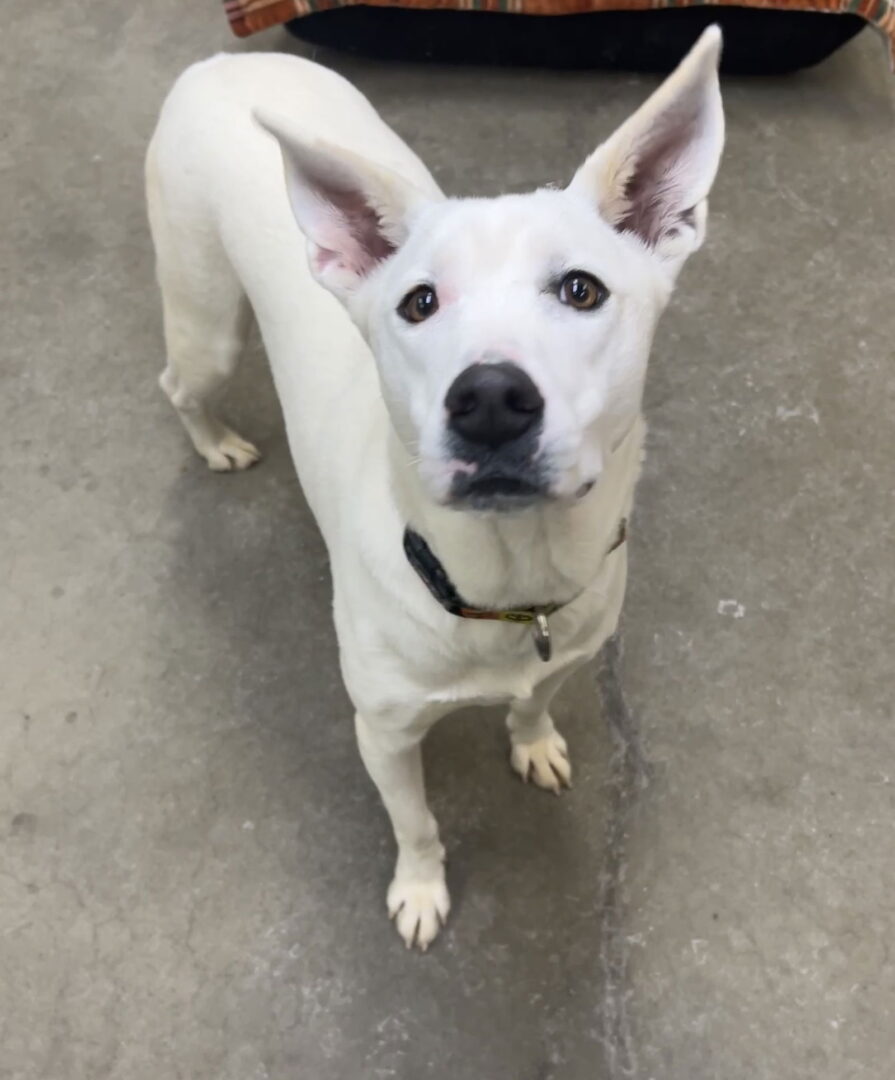Meet Fiona, a beautiful white girl with the sweetest soul. Fiona is about 1 year old and weighs 55 lbs. She is a very sweet, gentle dog who loves everyone she meets. Fiona is great with all people, wonderful with kids, and does well with other dogs. She also walks nicely on leash and enjoys getting out for walks. Fiona is spayed, microchipped, and up to date on vaccines. She’s ready to find a loving forever home where she can be someone’s best friend. (function () { // Only on animal detail pages if (!//animals/detail/i.test(location.pathname)) return; // Debounce to avoid double-fire (touchend + click, etc.) var lastNavAt = 0; function toFullSize(url) { try { var u = new URL(url, location.href); u.searchParams.delete(’width’); u.searchParams.delete(’height’); return u.toString(); } catch (e) { return url || ”; } } function looksLikeAnimalPhoto(url) { return //pictures/animals/d+/d+/[^?#]+.(jpg|jpeg|png|gif)/i.test(url || ”); } function handler(e) { var el = e.target; if (!el) return; // Find the closest anchor or image in the click path var a = el.closest ? el.closest(’a’) : null; var img = el.closest ? el.closest(’img’) : null; var url = ”; // Prefer anchor href if it points to an animal photo if (a && a.getAttribute) { var href = a.getAttribute(’href’) || ”; if (href && (href.indexOf(’/pictures/animals/’) !== -1 || looksLikeAnimalPhoto(href))) { url = href; } } // Otherwise fall back to the image src if (!url && img && img.getAttribute) { var src = img.getAttribute(’src’) || ”; if (src && (src.indexOf(’/pictures/animals/’) !== -1 || looksLikeAnimalPhoto(src))) { url = src; } } if (!url) return; // Absolute URL + full-size version try { url = new URL(url, location.href).toString(); } catch (_) {} url = toFullSize(url); // Stop PrettyPhoto (and any other delegated click handlers) e.preventDefault(); e.stopPropagation(); if (e.stopImmediatePropagation) e.stopImmediatePropagation(); // Debounce var now = Date.now(); if (now – lastNavAt < 500) return; lastNavAt = now; // SAME TAB navigation to the full-size image location.href = url; } // Capture phase is the key: we get the event before PrettyPhoto. ['click', 'pointerup', 'touchend'].forEach(function (evt) { document.addEventListener(evt, handler, true); }); })();