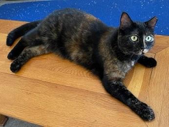 Hello! We’re Freda and Holly! We were rescued with our sisters from a backyard in San Francisco and we’re so glad to meet you. I’m a sporty, dynamic Tortoiseshell with a bit of spicy “tortie” personality to match. I can be a bit feisty at first, says the Tortie… hehe, but all I need is some time to relax and for us to get to know one another and then my playful personality will emerge. I love to play with the cat dancer toy and am quite the flying acrobat! Another way to my heart is offering me some treats and I’ll even lick Churus right off your finger. After some time and some play, I’ll happily welcome some head scratches and pets and will give you a little tap if I want more! I love spending time by the windows so I can surveil the neighborhood and like to meow at the people passing by. I would be happy as an only cat while I’m finding my rhythm in my new home. I will likely start off shy, but running laps around a cat tunnel and being provided with a rousing DaBird play session will soon bring out my exuberant purrsonality! I’m looking for a kind and patient, cat savvy human. My sometimes sweet and sometimes sassy purrsonality will win your heart! Please note:Freda should be adopted with a littermateIndoor only For more information & an online application go to https://www.givemesheltersf.org/adoption/cat.php?id=12068&ts=1737187351&src=rg