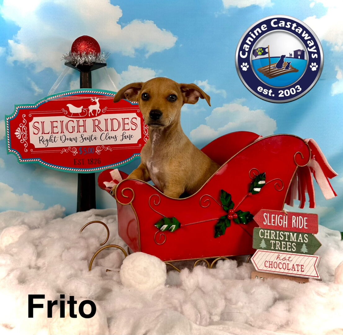 Filling out an application from our web site at www.caninecastaways.org is the first step in adopting a new furry family member.We are only considering applications in our local area – 1 hour or less from Arcadia FL – see below for more info. You must live in a single family home in order to be considered – puppies of this age cannot be in grassy or common areas where any other unknown dogs have been so places like condos, apartments, villa homes, etc. are not options. We do require that you have recent verifiable dog/puppy history and excellent vet history in order to be considered for adoption of a puppy. IF YOU DO NOT MEET THESE REQUIREMENTS YOUR APPLICATION WILL NOT BE PROCESSED. IF YOU ARE INTERESTED IN ADOPTING THE FIRST STEP IS TO FILL OUT AN ADOPTION APPLICATION ON OUR WEBSITE AT: https://www.caninecastaways.org/adoption-application IF A PET IS LISTED THEN THEY ARE AVAILABLE – WE KEEP OUR LISTINGS UP TO DATE AND REMOVE AS SOON AS ADOPTED. NAME: Frito BREED: Chihuahua mix SEX: male COLOR: tan/white AGE: born 9/26/24 WEIGHT: 4.9 lbs as of 12/4/24 FOSTERED BY: LOCATED IN: NOTES FROM FOSTER FAMILY: We are only considering homes in our local area – 1 hour or less from Arcadia FL. If you have adopted from us before and are slightly out of that area, please contact us directly and we can discuss it. The puppies are too young to be spayed/neutered yet and still need a few more rounds of vaccines as well as to be spayed or neutered.. All vaccines and spay/neuter surgery will be done at our vet's office in Arcadia so you must be willing to bring them to their appointments in order to be considered for adoption. If you are interested in adopting please complete our Adoption Application by copying and pasting the following link into your web browser: http://www.caninecastaways.org/adoption-application For a full list of dogs we currently have for adoption use this link: https://www.caninecastaways.org/adoptable-dogs MEDICAL INFO: The following has been or will be done for this puppy at the appropriate age… – Basic Exam by Veterinarian – Spayed or Neutered – Placed on heartworm preventive – Basic Bloodwork – Microchipped – Intestinal Parasite Exam and medication – Vaccinations – Placed on flea preventive ADOPTION DONATION: $400 This adoption donation helps to cover the vet expenses for this puppy including heartworm preventive which is dispensed at the initial vet visit and then goes with the dog at adoption. All vet records will be provided to adopter. Visit us at www.caninecastaways.org