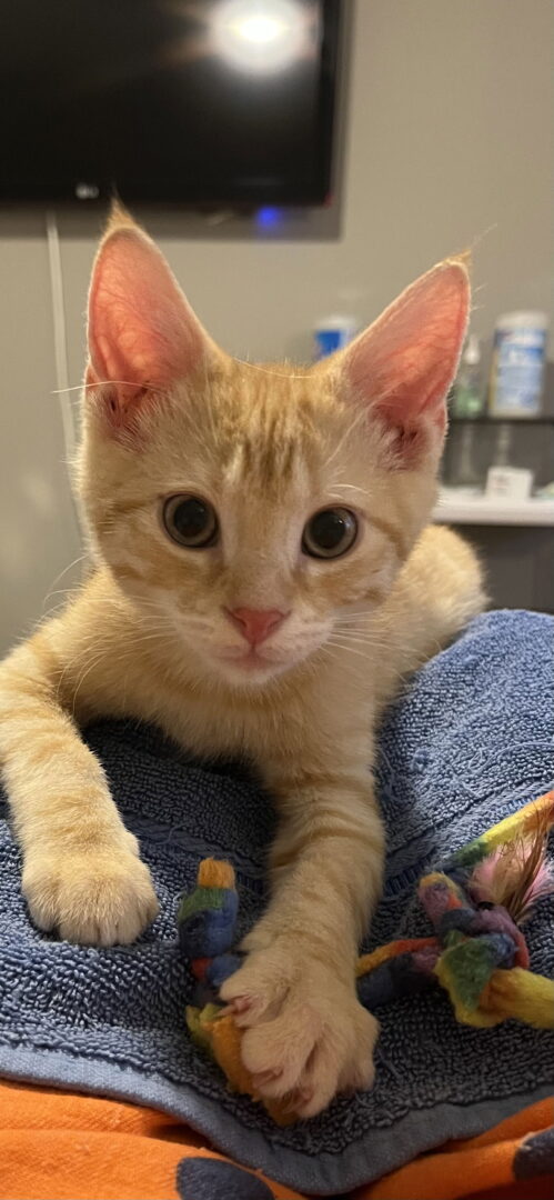 Frito is a 3-month-old (as of 1/2026) orange tabby male kitten. He is incredibly friendly, rubbing up against whomever enters the room with his tail in the air and a purr. As the biggest kitten in his litter, Frito tends to lead the way. He is typically the first to try out a new toy and the other kittens follow his lead. Not surprisingly he is the first to realize there is a lap available, and loves to be groomed and cuddled, purring loudly. Frito needs to be in a household with another kitten or young cat to play with, and would love to be adopted with his sister, Triscuit (FCID #01/06/2026-131). He is very good with children and would likely be fine with a dog if given a proper introduction. Frito has a good appetite (and is usually first to the food!), is a very tidy litter box user and is up to date on his vaccinations. Frito, Triscuit, SunChip and Ruffles are playing with their foster family. Please submit a no-obligation application for a meet and greet or to adopt: https://forgottencats.org/adoption-application/. Thank you! (Foster: Shirley G.).