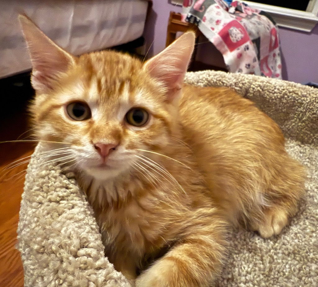 Hello, My name is “Fu” short for Fu Manchu due to my curling whiskers! I am a handsome ginger tabby with a hint of white on my chin. I and my three siblings were brought into the SAFC adoption program after being recovered from a patio of an elderly lady fearful for our safety and futures as outdoor kittens. I am a gentle boy. I enjoy pets and especially my foster mom stroking my eyes until I drift off to sleep. I like to chase the flutter butterfly my foster mom has for us; laying in the window watching the birds and squirrels; and I like to curl up in my kitty tower. Can you be the one to replace my foster mom to lull me to sleep?To inquire about adopting this cat please complete an adoption application at tinyurl.com/ccapadoptions Once you submit an adoption application, a foster will reach out within 48 hours to schedule a meet-and-greet or ask any additional questions. If you haven’t heard back within that time, please contact **adoptions@sanantonioferalcats.org** so we can follow up. If the cat you’re interested in isn’t listed in the dropdown menu, it may be pending adoption or recently adopted, but the website hasn’t been updated yet. Feel free to email us for confirmation. Thank you for choosing to adopt one of our amazing cats!