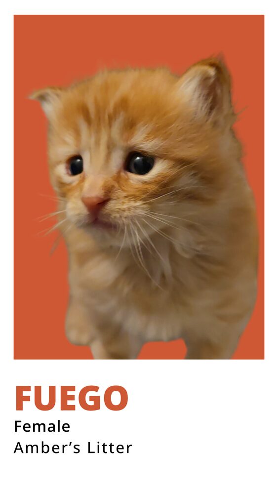 Meet Fuego! Status: Available for AdoptionBreed: Domestic Long Hair MixGender: FemaleFuego is a stunning little girl who is ready to set your heart ablaze! With her vibrant Orange Tabby coat and gorgeous Long Hair, she is a rare beauty and a true standout in her litter. Fuego is a social kitten who is growing more curious every day. She is part of Amber's Litter, and while she currently loves playing with her siblings Inferno and Blaze, she is looking for a forever home where she can be the center of attention.What Makes Fuego Special: The "Fluff" Factor: Her long, soft orange fur is her crowning glory— Social Butterfly: She is very attached to her mama, Amber Eyes, and enjoys the company of her siblings. Rare Gem: Female orange tabbies are actually quite rare (only about 20% of orange cats are female), making her a special find! Note: Fuego is currently not yet spayed or vaccinated due to her young age. All kittens from HDBnQ Rescue will be spayed/neutered prior to adoption unless a specific contract and deposit are arranged.Adoption Fee: $400 All cats/kittens will be spayed/neutered unless spay/neuter contract is signed with additional deposit.For more photos and videos please see our website www.hdbnqrescue.org/queens youtube page: https://www.youtube.com/@HDBnQRescue