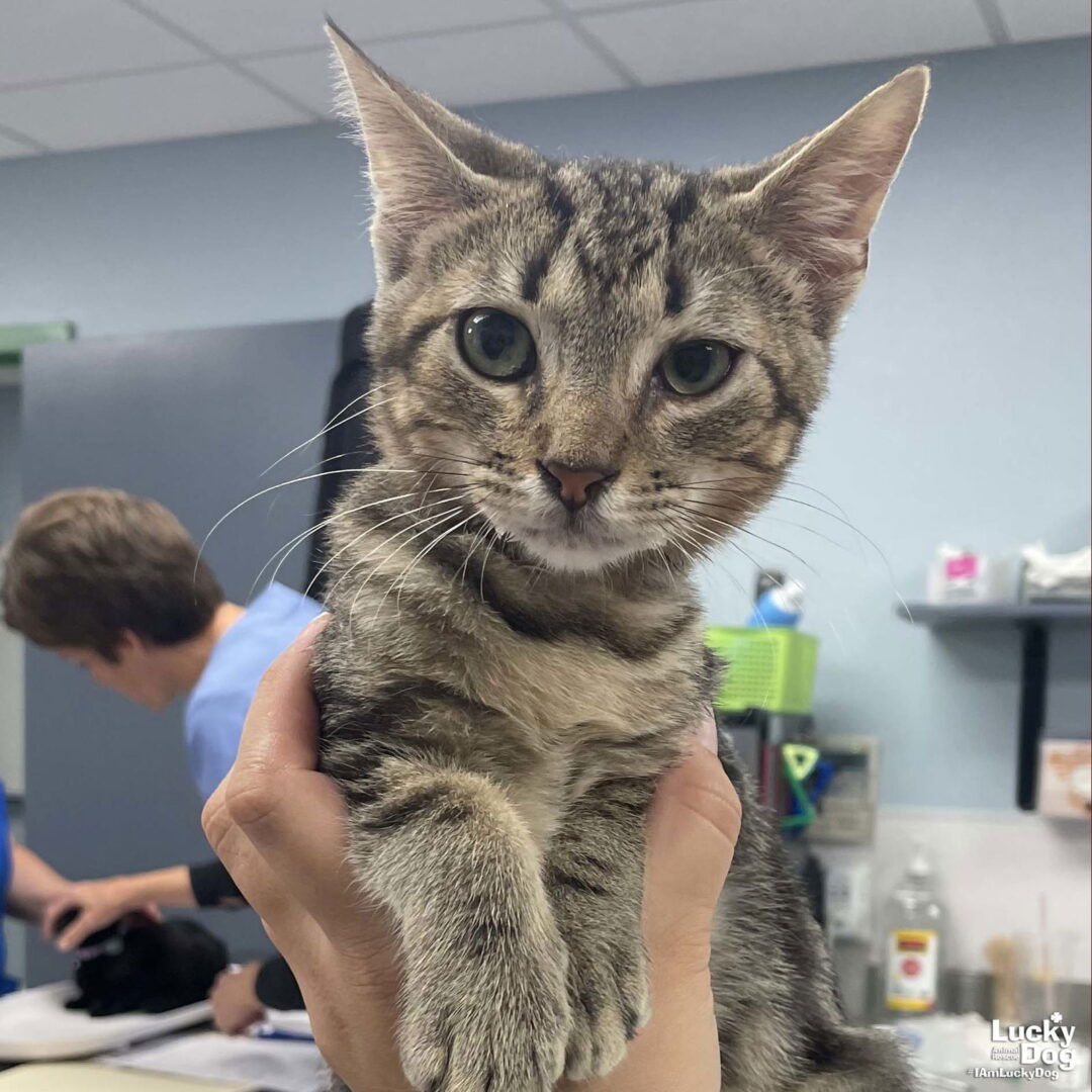 Please contact Lauren McCarty (laurenmc@luckydoganimalrescue.org) for more information about this pet.Gabrielle wants to come home with YOU!GABRIELLE NEEDS A FOREVER HOME! Name: Gabrielle Best Guess for Breed: Domestic Short Hair Age: 3 months — Est. DOB: 8/25/24 SEX: Female Approximate Weight: 4.4 lbs Coloring: Brown Tabby Type of Hair: Short Gets Along With: Because of her young age, Gabreielle will likely get along with other cats, dogs and kids with an acclimation period. We’re happy to help with tips and tricks! Litter: Great Angelica, Gabrielle Currently Living at: PetSmart Oxon Hill (6005 Oxon Hill Road Oxon Hill, MD 20745) Come say hello to me during the store’s operating hours! I am located in the Petsmart Adoptions center area on the right side of the store! If you want to play with me or adopt me, you will need to complete the adoption process through Lucky Dog Animal Rescue! I am Looking For: My loving forever family! Hi! I’m Gabrielle, and I am a cute little kitten! I won’t ask for much- just some love, cuddles and lots of toys so I can run and play and be my kitten self. Two cats are more fun that one, and I’d love to be adopted with my super cute siblings (not required, but it’s true– two kittens ARE better than one!). What my Foster Says About Me: Coming soon! Kitten Vetting Requirements: Your kitten may not be fully vaccinated upon adoption. You will be responsible for providing whatever remaining vaccines are needed to complete the kitten vaccine series. Due to this kitten’s young age, she/he has not yet been spayed or neutered. As part of the adoption contract, it will be your responsibility, as the adopter, to ensure that this is done no later than 2/25/25. There are NO EXCEPTIONS and NO EXTENSIONS to this date. A non-refundable spay/neuter deposit will be collected if you would like Lucky Dog to pay for this animal to be spayed/neutered at one of our low-cost partner vets. TO ADOPT: The adoption fee for adult cats is $200 ($350 for two cats adopted together). The adoption fee for a kitten (under 7 months old) is $220 ($380 for two kittens adopted together).If you are interested in adopting, please complete the Adoption Questionnaire online at bit.ly/adoptaluckycat. Lucky Dog Animal Rescue does our best to provide accurate information about the cats we have for adoption. That said, we cannot make any guarantees about age, breed or temperament. Thank you for contacting Lucky Dog Animal Rescue and helping to save a life! Please visit us online at www.luckydoganimalrescue.org . BE A FOSTER!!! Fosters make it possible for Lucky Dog Animal Rescue to save and care for homeless and abandoned dogs! To learn about fostering, please contact fostering@luckydoganimalrescue.org BE A SPONSOR!!!! Sponsors help Lucky Dog support the many dogs we save. To learn more about sponsorship, please contact info@luckydoganimalrescue.org !