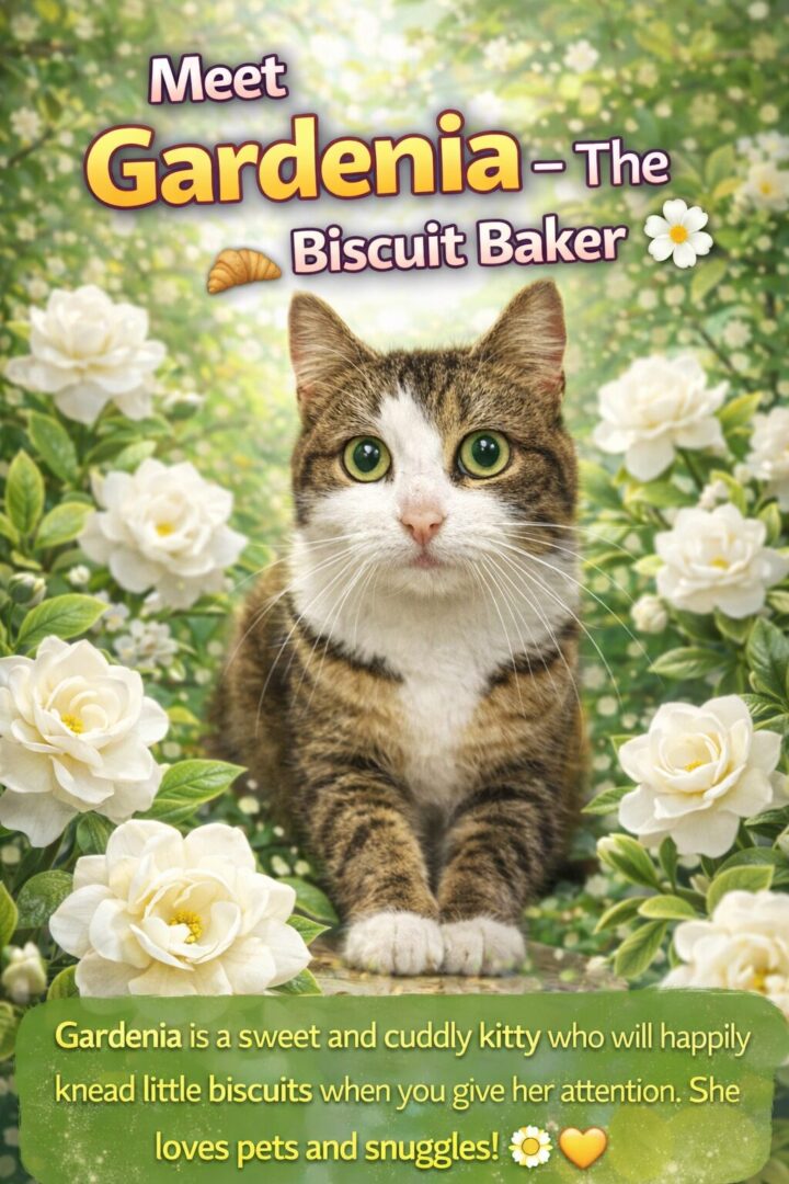 Gardenia – A Little Biscuit Maker . Gardenia is an incredibly sweet kitty with the most adorable way of showing affection. When you sweet talk this lovely girl, she starts making the cutest little biscuits, happily kneading away while enjoying the attention. Gardenia absolutely loves cuddles and pets, and she seems to melt when someone spends time with her. Her gentle personality and loving nature make her a wonderful companion for anyone looking for a cat who truly enjoys being close to people. With those bright, curious eyes and her biscuit-making skills, Gardenia is sure to bring warmth and happiness to any home lucky enough to adopt her. Come meet Gardenia and see just how sweet this little flower really is. . Please submit our no-obligation Adoption Application for a meet and greet or to adopt: https://forgottencats.org/adoption-application/. Not ready to adopt? Please consider fostering: https://forgottencats.org/foster-a-cat/. Thank you! (Foster: Trainer)