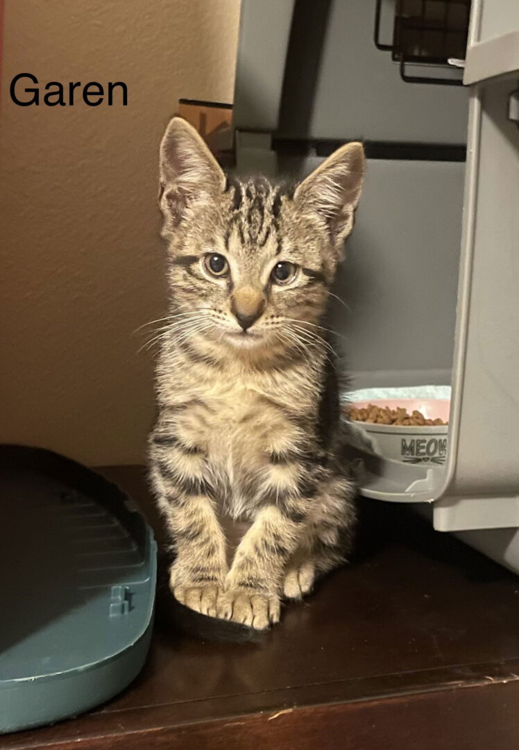 See Garen’s HomepageGo to our official websitePlease contact Kim (Kmontes1969@gmail.com) for more information about this pet.Garen came to foster after he and his 4 siblings were found with their mother. All six have been in my kitten room for over a month. He enjoys playing and sitting in your lap. He has been the mommas boy-loving to hang out with his momma.. He is litterbox trained, eats wet and dry food and greets me when I enter the room. He is a little shy at first, but loves to play. He has been neutered and is ready to go home today. He has all of his kitten vaccines, be microchipped, dewormed and receive flea medication. The adoption fee is $50.00 and kittens are always BOGO. If you would like to meet him, email her foster mom at: kmontes1969@gmail.com