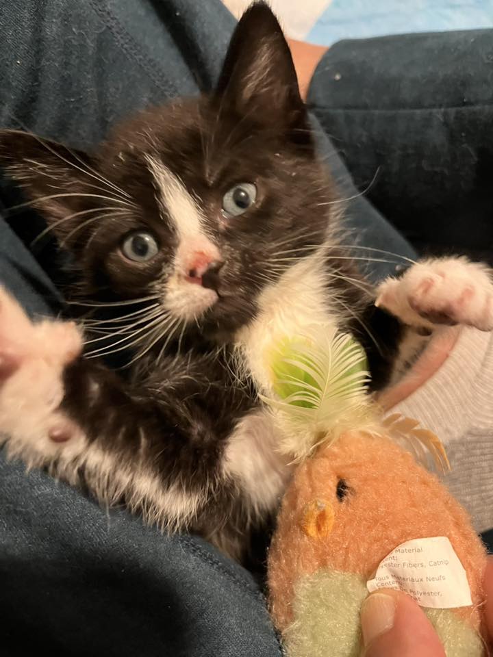 Please contact Jamie (jamiecr@comcast.net) for more information about this pet. Want to meet? [Fill out the Application], then email it to the contact in this bio. Littermates Elaine, Jerry, George, and Kramer Adopt Elaine, Jerry, George, and Kramer! Born around 2/26/26, these sweet siblings were rescued after being found crying next to a busy road. Elaine is a fluffy tortie, and the rest are fluffy tuxedo boys. Jerry has a classic tuxedo face, George has a white stripe on his nose, and Kramer has black fur with a white chin, white front, and white booties. All have soft medium length fur. The siblings have adapted well to indoor life and use the litterbox with perfect manners. They love people and will run right up to you for cuddles and pats. All are lap kittens. They wrestle and cuddle each other and will entertain you for hours and hours. Elaine, Jerry, George, and Kramer should be adopted in pairs. If you are interested in providing them with a loving forever home, contact sponsor Jamie at jamiecr@comcast.net and foster Nisha at nkchauhan@gmail.com. They are located in Contra Costa County, CA. Click here to watch a video of George (adopt with Elaine, Jerry, or Kramer).